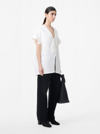 The Circe top is cut to a loose, relaxed silhouette that moves in harmony with the body. Crafted with a wide V-neck front panel, mock sleeve cuffs and a front split, Circe is embodied by its bouncy woven construction that effortlessly amplifies the fluid frame. DETAILS - V-neckline - Mock sleeve cuffs - Front split - Wide V-neck panelRebecca is 5’10” / 177.5 cms and wears a size UK8 CARE 73% Viscose 27% Linen Do NOT Wash | Dry Clean Only Made in Portugal