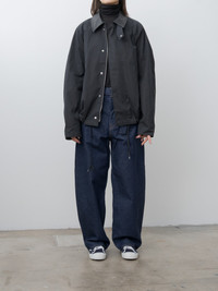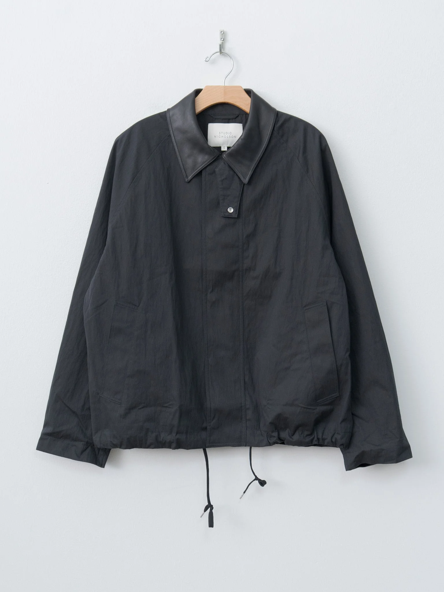 The Dani jacket is Studio Nicholson's take on the enduring trench silhouette. It's made from a technical and water-repellent cotton nylon blend that has been washed and gently faded for a vintage feel. Details include a contrast collar in buttery leather, throat latch, zip and snap button front and an internal drawcord hem. - 70% Organic Cotton, 30% Recycled Nylon - Available in Washed Black - The model is 5'7"/170cm and wears size S - Unisex sizing - we recommend sizing down one size