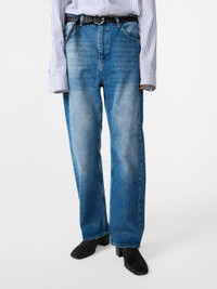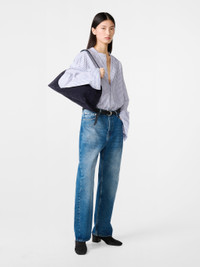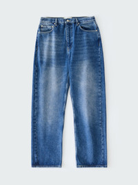 The Denjo jeans have a wide leg that’s softly shaped with a forward seam, creating an ergonomic fit that feels relaxed and wearable. This pair is cut from denim woven with regenerative cotton in a rich washed-indigo shade. DETAILS - Five-pocket construction - Metal rivets - Button and zip fly - Wide leg with front seam - Cut from denim made with regenerative cottonXinyue is 5'11" / 180cms and wears a size UK8 CARE 52% Regenerative Cotton 48% Cotton Wash at 30°C | Warm Iron