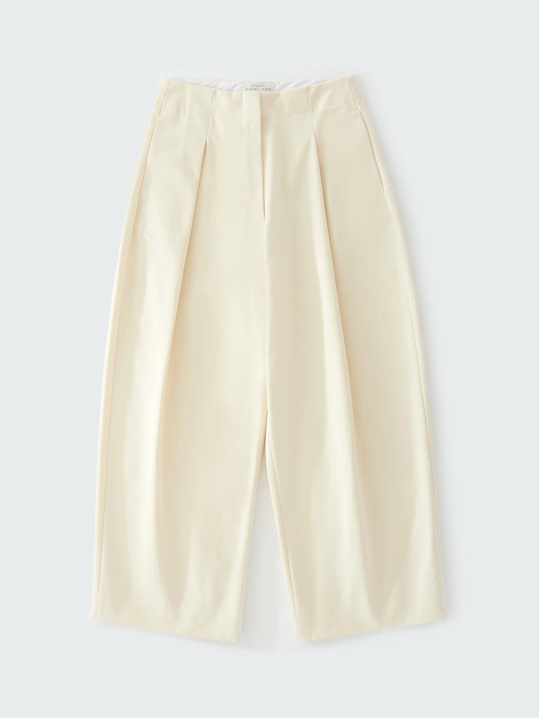 Our ever-popular Dordoni pants feature a high waist, drop crotch, and gently curved leg shape. Deep single pleats reference traditional tailoring. For this seasonal style we've used our signature Italian peached cotton twill for a soft hand feel. DETAILS - Deep front pleats - Concealed zip fly with hook and bar closure - Two side seam pockets - Two rear welt pockets - Voluminous cut with curved leg - Cropped length Rebecca is 5’10” / 177.5 cms and wears a size UK8 CARE 100% Cotton Wash at 30°C | Dry Clean Made in Portugal