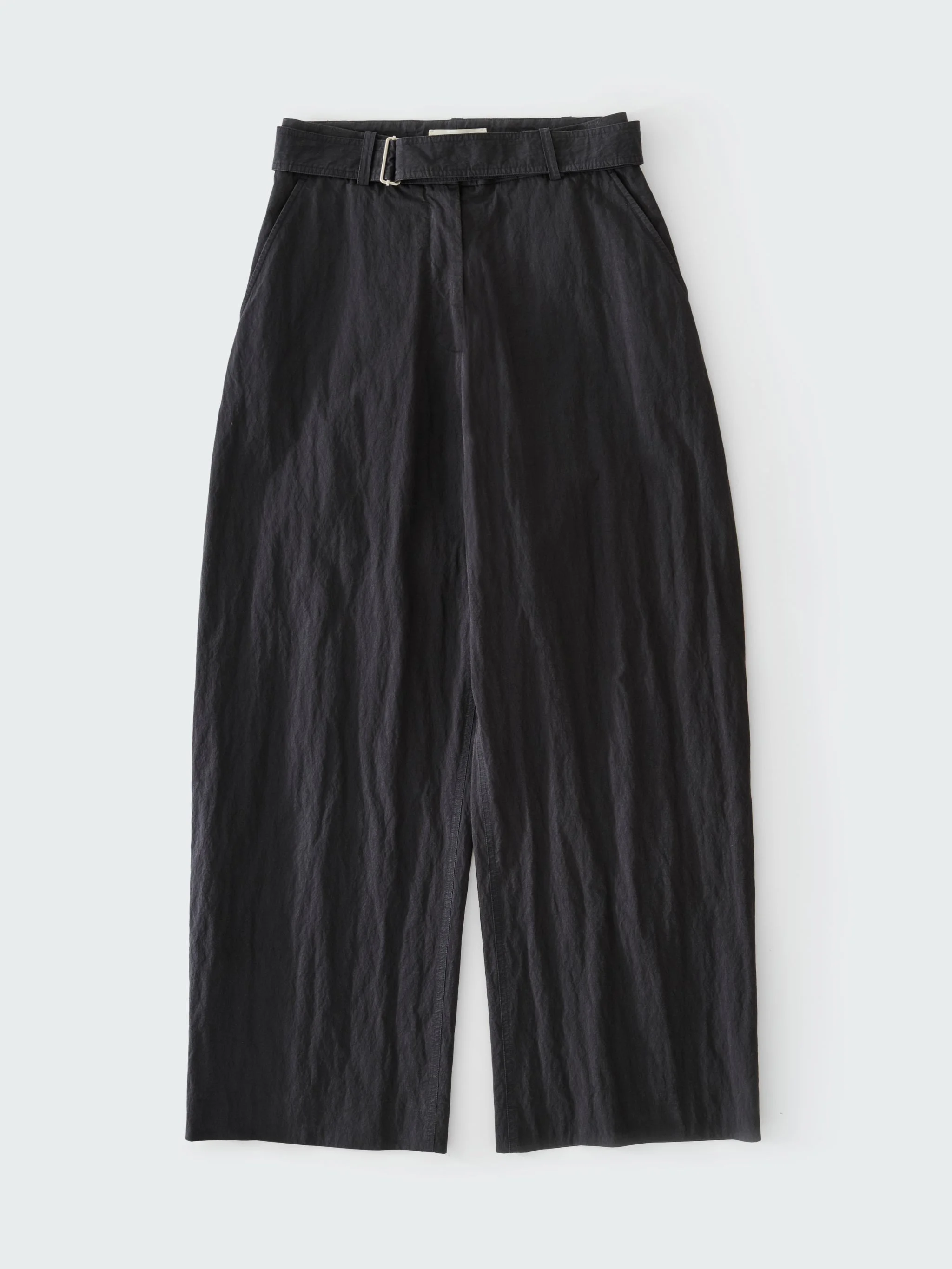 An evolution on Studio Nicholson’s staple Chalco pants, the Doring silhouette embodies a slightly slimmer profile with a matching slide buckle-fastening belt. This gently curved pair is cut from a noisy Japanese cotton and nylon blend that has a crisp, slightly crinkled texture and fitted with back patch pockets for a utilitarian feel. DETAILS - Slide buckle-fastening belt - Hook and zip fastening - Side slant pockets - Back patch pocketsRebecca is 5’10” / 177.5 cms and wears a size UK8 CARE 55% Cotton 45% Nylon Do NOT Wash | Professionally Wet Clean Only