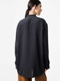 The lightweight Faber shirt is woven in a fine darkest-navy-and-almond crinkle fine stripe fabric that’s unique to Studio Nicholson, and has a washed, gently textured hand feel. Its clean and simple aesthetic is thanks to a concealed front placket and minimal topstitching. DETAILS - Grandad collar - Concealed placket - Mother-of-pearl buttonsRebecca is 5’10” / 177.5 cms and wears a size UK8 CARE 76% Modal 20% Polyamide 4%Polyester Delicate Wash at 30°C | Cool Iron Made in Portugal