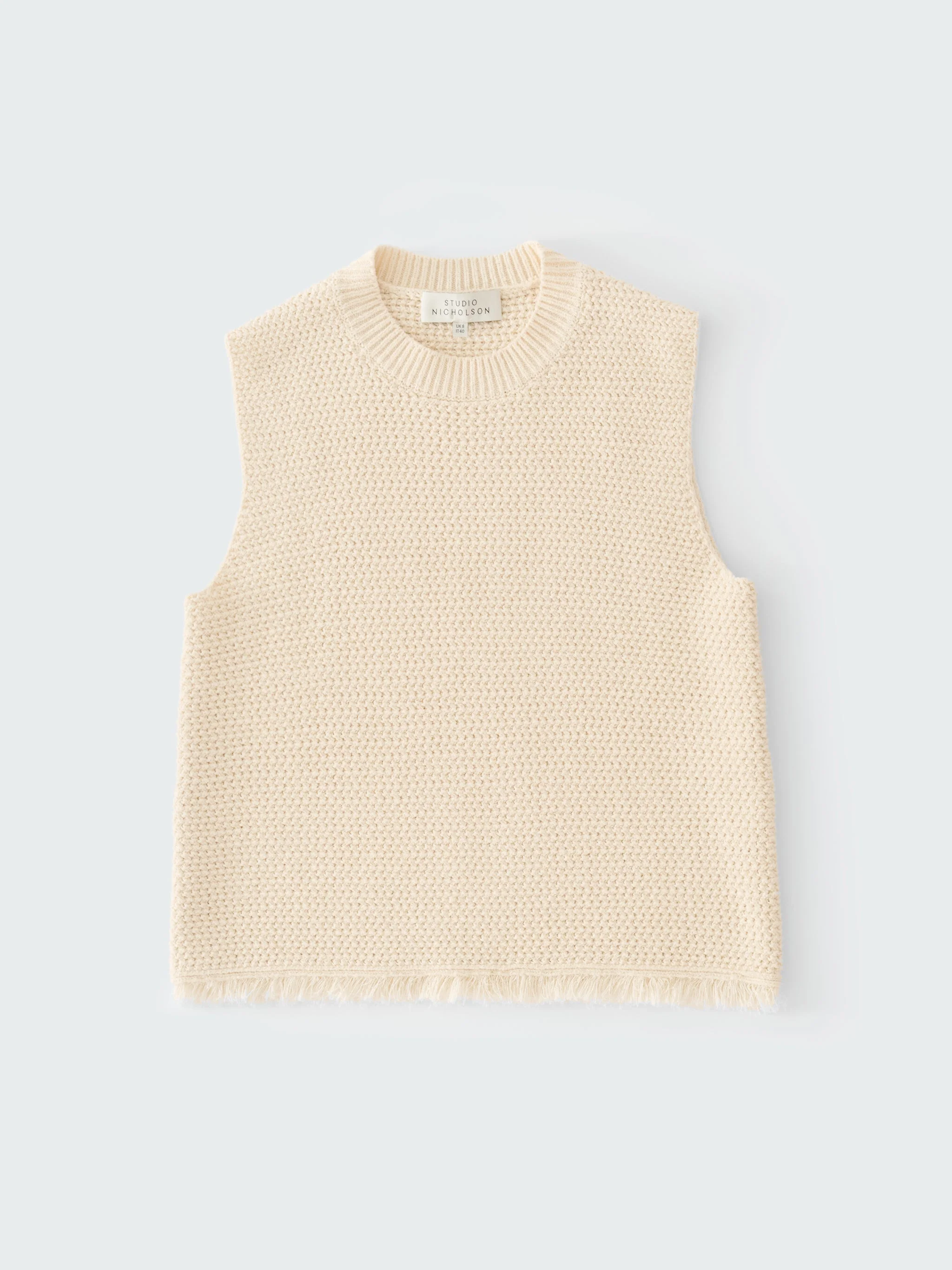 Studio Nicholson reimagines the enduring vest silhouette – a mainstay of any warm-weather wardrobe – with this Fray iteration. It’s knitted from slub cotton boucle yarns to give a textured hand feel, then shaped with a ribbed neckline and a finished with a fringed hem, further accentuating the textural mood. DETAILS - Round ribbed neck - Fringed hem - Textured knit - Wear it with the matching Rye SkirtXinyue is 5'11" / 180cms and wears a size UK8 CARE 80% Cotton 20% Nylon Hand Wash | Delicate Dry Clean