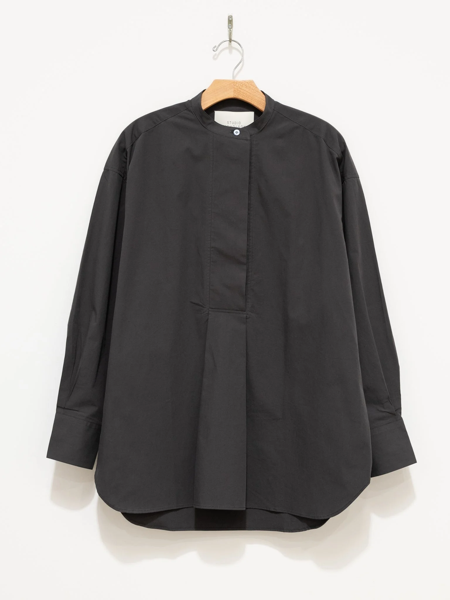 A light and structured half placket shirt from Studio Nicholson. The cotton has a subtle powder finish that is crisp and smooth to the touch. Details include a band collar with a concealed button placket, buttons at the cuffs, and a longer rounded split hem. Relaxed fit. - Made in Portugal - 100% Cotton - Asphalt (Dark gray) - Model is 5'7 and wears size 0/S