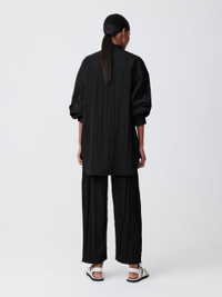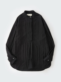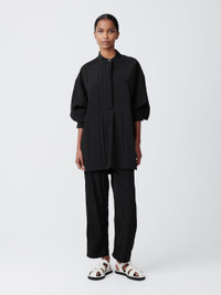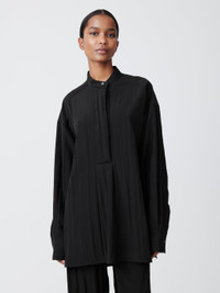 Frink is a popover style shirt with a half placket and a box pleated front for added volume. Its oversized fit makes it an easy piece to throw on, whether layered or worn as a standalone item. - Grandad collar - Wide concealed placket - Oversized fit - Bouncy tech viscose fabric - Wear it with the matching Toba Pant Isilda is 5'10" / 180cm and wears a size 1 DETAILS & CARE 89% Viscose, 11% Polyamide Made in Portugal Hand Wash / Dry Clean