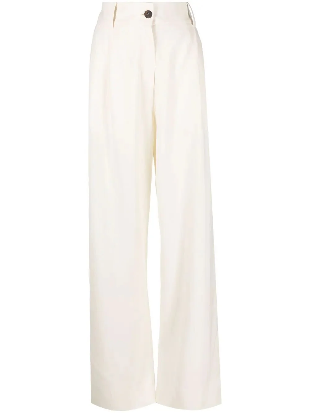 high waisted straight leg trousers white virgin wool blend zip fly fastening belt loops straight leg Imported Composition Virgin Wool 55%, Viscose 45% SIZE & FIT Model measurements Height 5 ft 10 in(1.78 m) Bust/Chest 33.07 in(84 cm) Hips 35.82 in(91 cm) Waist 25.98 in(66 cm) FittingInformation This piece fits true to size. We recommend you get your regular size Designed to be fitted at the waist, loose over the leg Made with a mid-weight non-stretch fabric Washing instructions Dry Clean Only