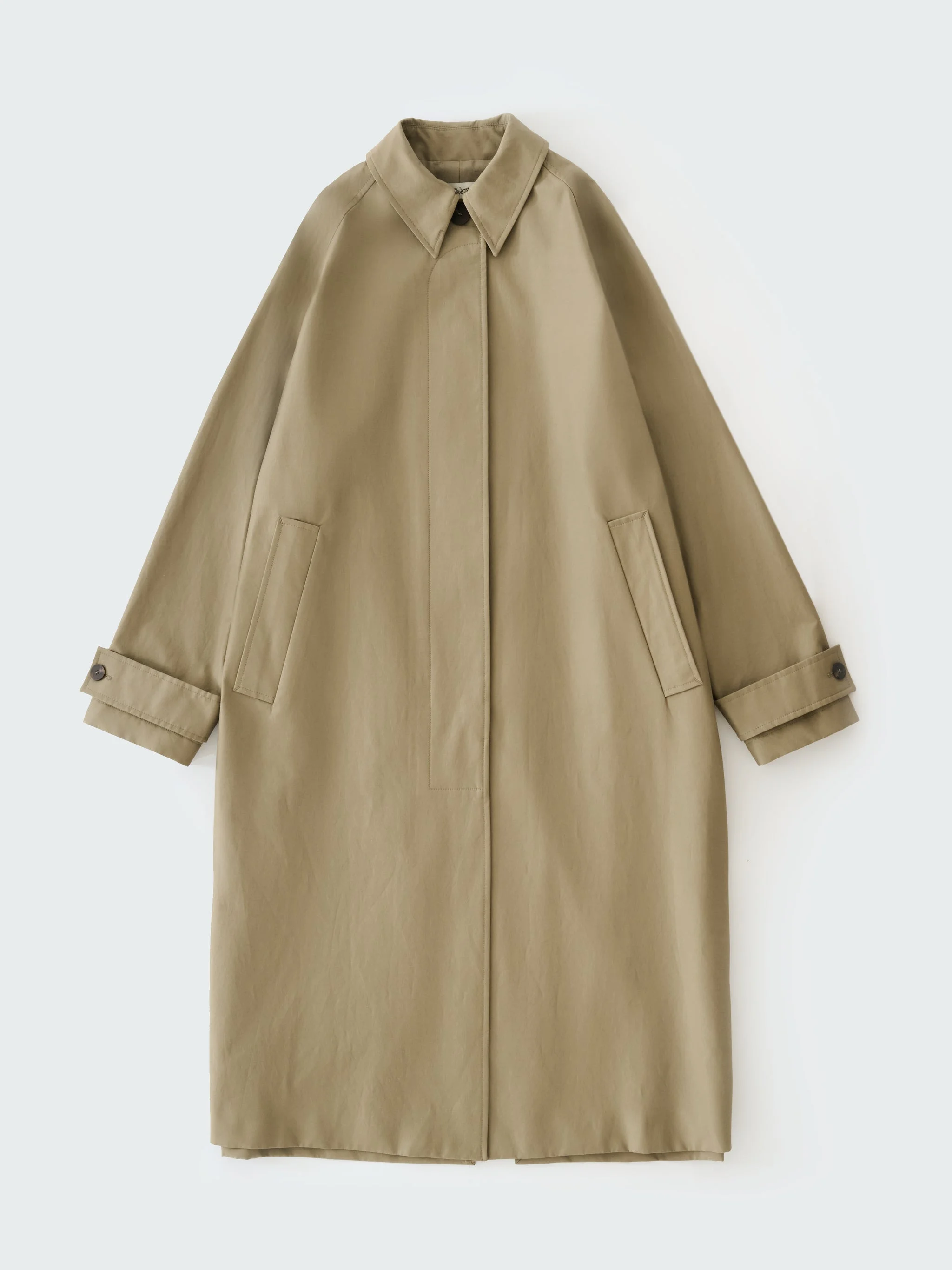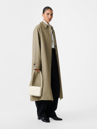 A loving tribute to classic trench coats, Holin’s raglan shoulder and full, voluminous cut make it a sophisticated outerwear choice that’s easy to style. The fabric is a substantial cotton and nylon blend that’s woven in a twill construction and treated with a PU coating, giving it a technical handle and water-repellent finish. DETAILS - Classic collar with button-fastening tab and hook - Button front with concealed placket - Buttoned adjustable cuff tabs - Two front pockets - Large rear button-fastening vent - Internal patch pocket - Soft twill lining - Oversized fit Miko is 5'9" / 177cms and wears a size UK8 This style is designed to be oversized. For a more regular fit, take a size down CARE Main Fabric: 59% Cotton 41% Polyamide Lining: 51% Viscose 49% Cotton Delicate Dry Clean Only Made in Portugal