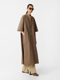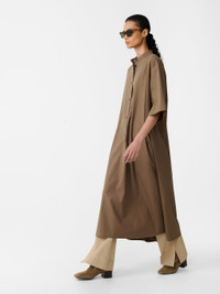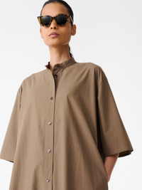 Studio Nicholson’s penchant for clean lines is evident in the Ikela dress. It’s deftly cut from panels of our noisy cotton fabric: a cotton poplin that’s treated with a light coating to create a satisfying ‘snap’ sound and a crisp hand feel. Shaped to an easy popover silhouette, Ikela has a grandad collar and travelling side seams that amplify the volume in the generous A-line shape. DETAILS - Grandad collar - Side slip pockets - Half placket silhouettes - Rear inverted box pleatNataly is 5'10" / 177 cms and wears a size UK8 CARE 100% Cotton Delicate Wash at 30°C | Dry Clean Made in Portugal