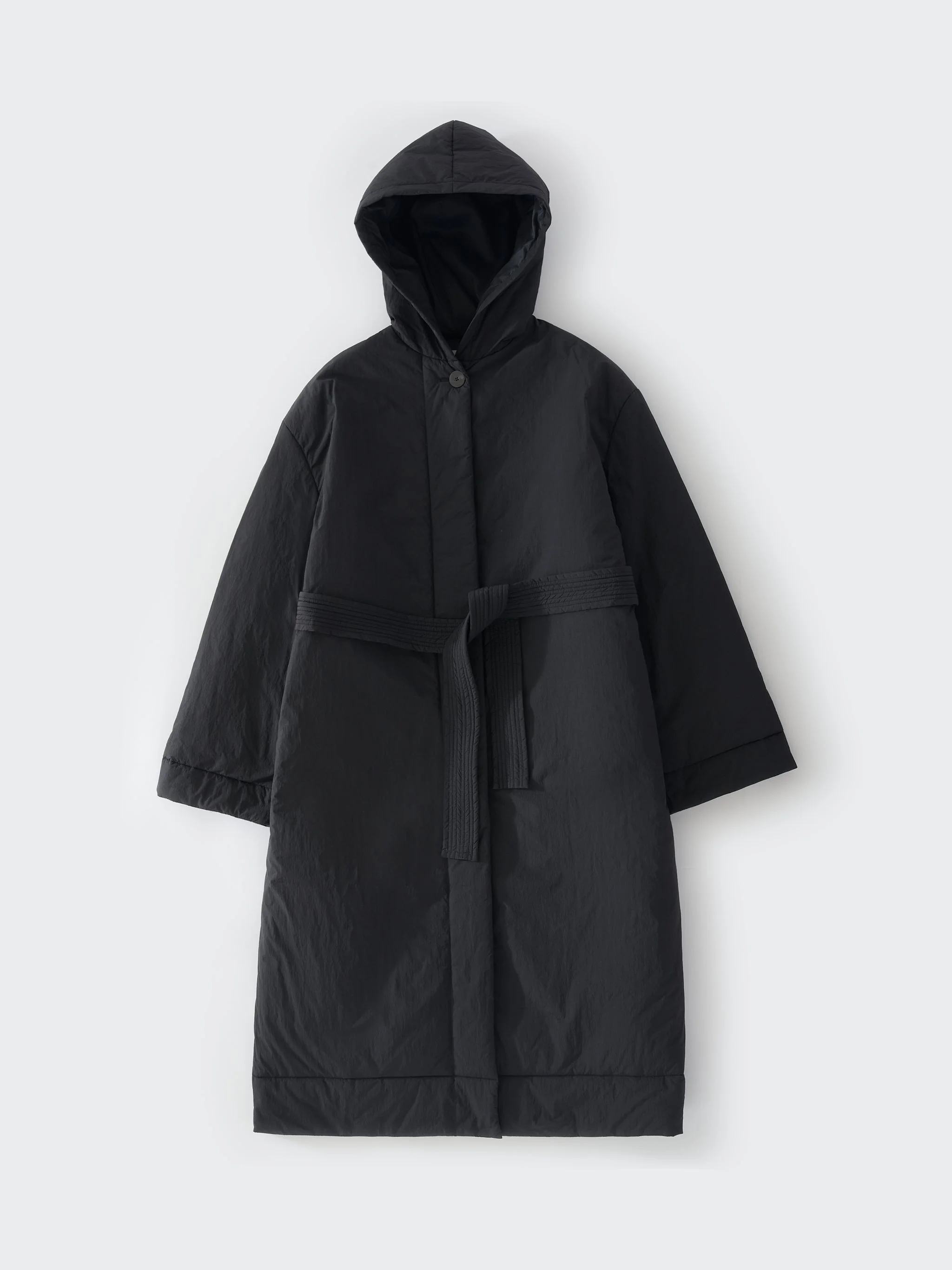 Our Kariba coat is constructed from a powder-coated parachute nylon, and filled with Ecodown fibres for superior heat retention. Its design diverges from typical down jackets in the inclusion of a hood and a belt, the latter adding shape to its voluminous silhouette. - Concealed front placket - and pockets on side seams - Powder finish parachute nylon with Ecodown filling - Generous, oversized fit Rebecca is 5’10” / 177.5cm, she wears a size 0Runs large, for a less oversized fit take a size down from your usual size DETAILS & CARE Shell: 100% Polyamide Filling: 100% Recycled Polyester Lining: 95% Polyester, 5% Elastane Made in Portugal Dry Clean Only