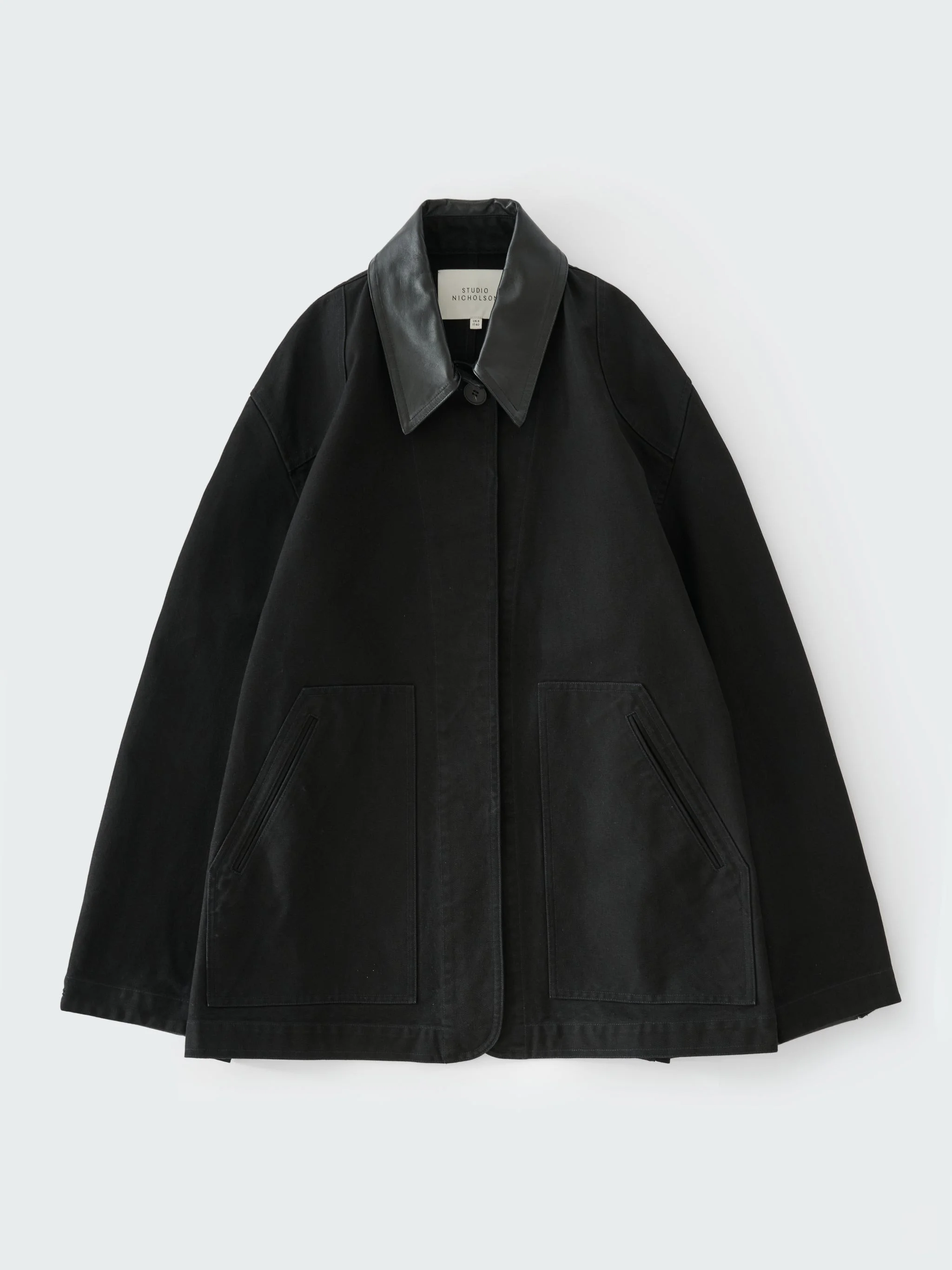 Inspired by a vintage men’s workwear piece, Leader is an evolution of the classic chore jacket. It’s cut from a heavyweight cotton canvas that’s garment-dyed to achieve a softer, washed-out feel and a vintage look. Constructed with articulated sleeves, angled pockets and twin needle stitching, Leader is elevated by a contrasting collar made from buttery leather. DETAILS - Leather collar - Articulated sleeves - Buttoned cuffs - Straight hem - Please Note: The collar is made of leather and should be cleaned by a specialist. Avoid contact with cleaning products while the rest of the garment is being dry cleaned.Nataly is 5'10" / 177 cms and wears a size UK8 CARE Main Fabric: 100% Cotton Collar: 100% Lamb Leather Do NOT Wash | Delicate Dry Clean