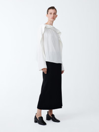 This Leland skirt is rendered from a double poly-viscose blend, which lends an effortless drape to the midi-length silhouette. Although minimal in design, it is punctuated by a deep knife pleat in the hem to deceptively mimic a front slit — a nod to Winter ‘24’s affinity for abstract shapes and forms. DETAILS - Back hook-and-zip fastening - Large folded hem - Flat felled seams - Matte double-poly viscose blend - Wear it with the matching Joyce JacketLouise is 5'11"/ 177.8 cms and wears a UK8 CARE 70% Polyester 30% Viscose Dry Clean Only Made in Portugal
