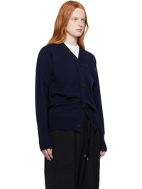 Knit extrafine merino wool cardigan. · Rib-knit Y-neck, hem, and cuffs · Button closure · Saddle shoulders Supplier color: Navy 100% extrafine merino wool. Made in United Kingdom 252608F095000