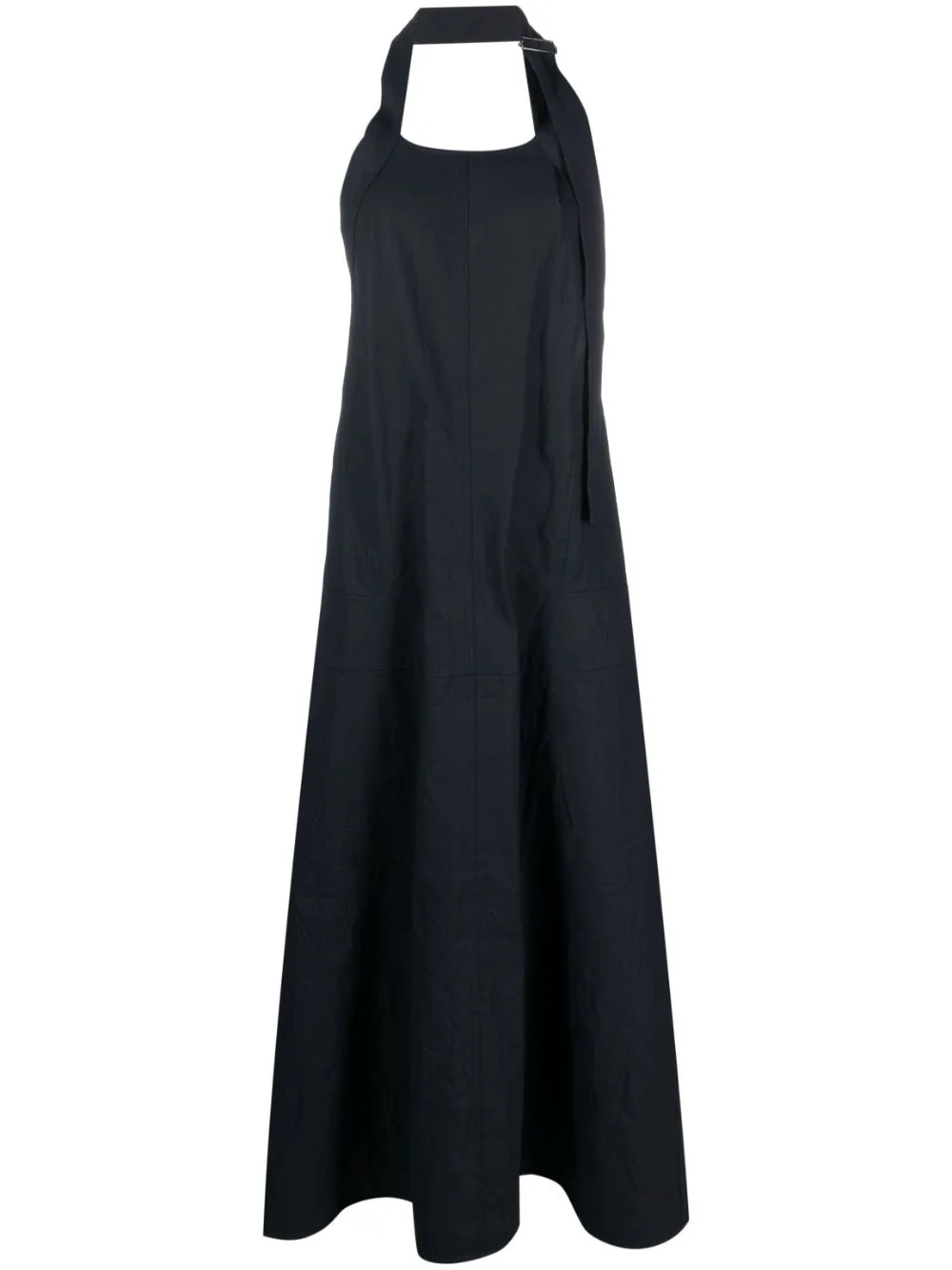 open-back flared long dress Highlights - Navy blue - Cotton-linen blend - Halterneck - Square neck - Open back - Rear zip fastening - Sleeveless - Flared skirt - Long length Imported Composition Linen/Flax 53%, Cotton 47% SIZE & FIT Model measurements Height 5 ft 10 in(1.78 m) Bust/Chest 33.07 in(84 cm) Hips 35.82 in(91 cm) Waist 26.96 in(68.5 cm) FittingInformation Designed to be unstructured, offering a loose fit throughout The adjustable shoulder straps allow for a preferred fit when worn Made from a midweight non-stretch fabric This piece fits true to size – take your usual size