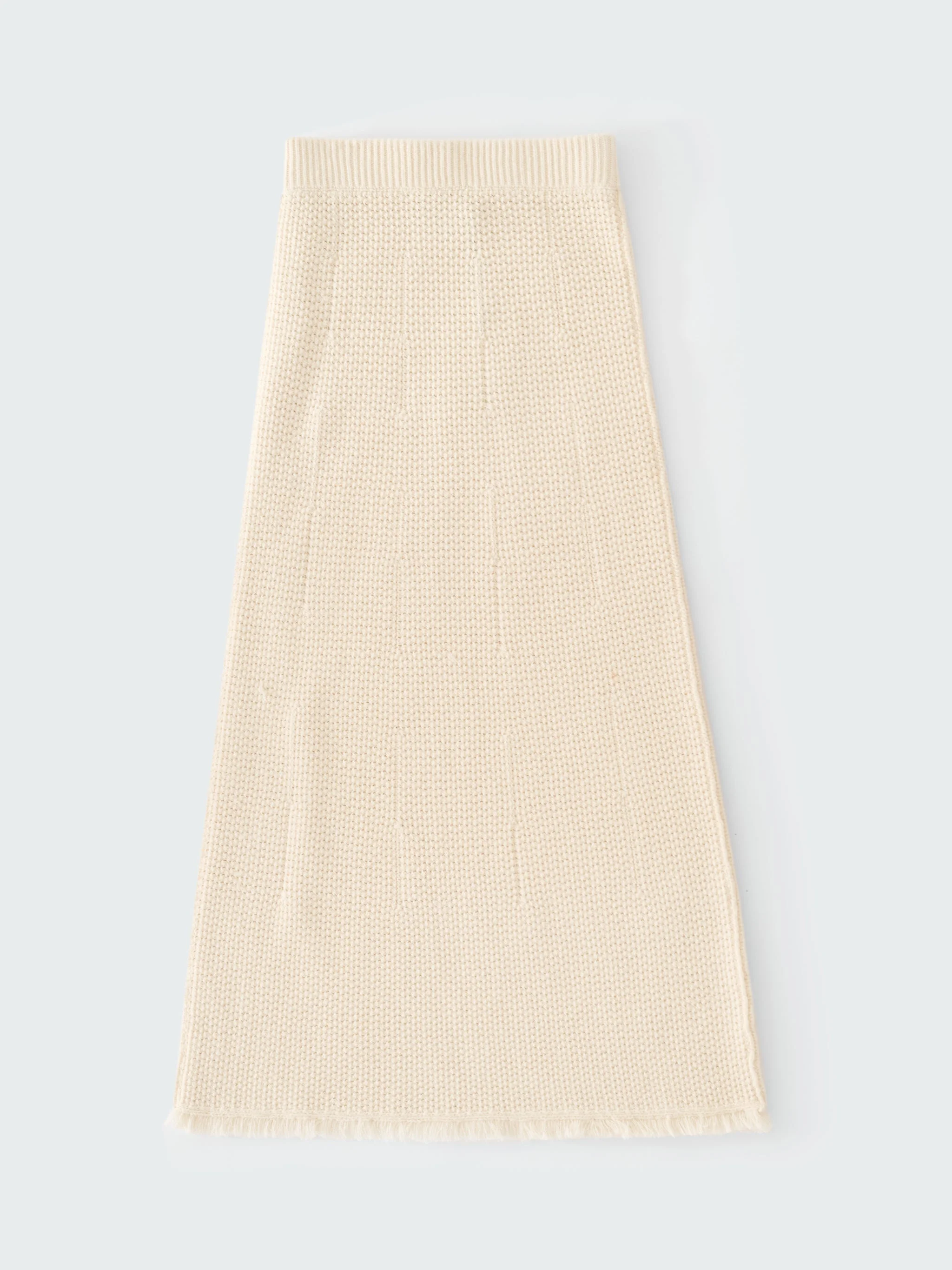 Studio Nicholson’s ‘fabric first’ philosophy is underpinned by this Rye skirt, which is constructed from panels of slub cotton boucle yarns to give a textured hand feel. Rye is crafted with an elasticated ribbed waistband, exposed side seams and a fringed hem, further accentuating the textural mood. DETAILS - Elasticated ribbed waistband - Exposed side seams - Fringed hem - Textured knit - Wear it with the matching Fray KnitXinyue is 5'11" / 180cms and wears a size UK8 CARE 80% Cotton 20% Nylon Hand Wash | Delicate Dry Clean