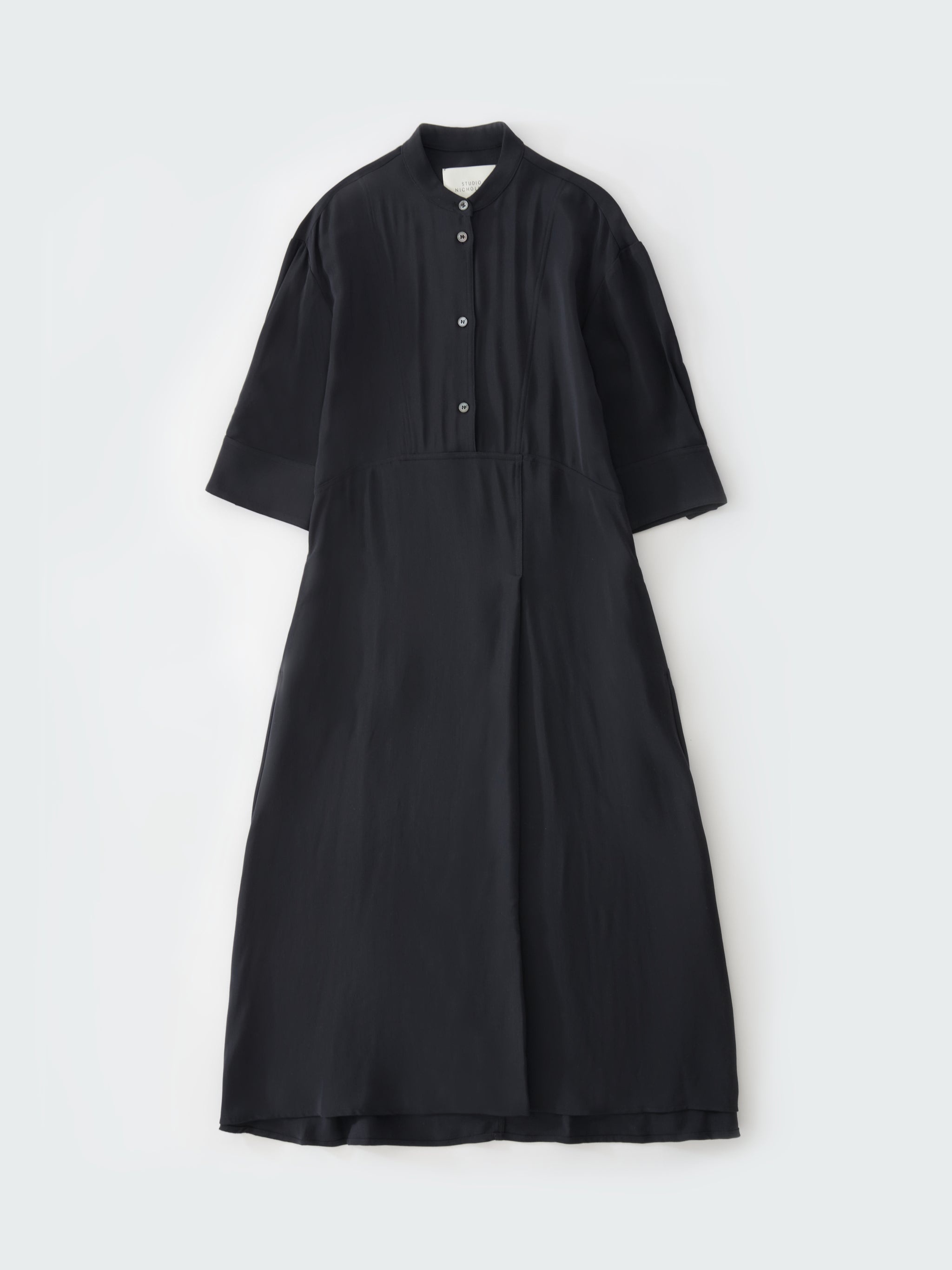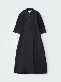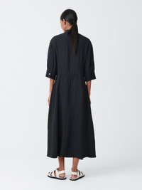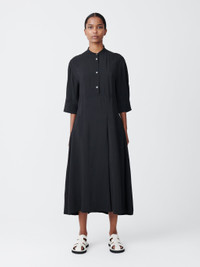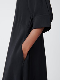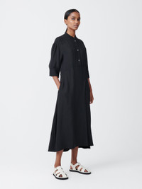 Sabo is a short-sleeved shirt dress with a grandad collar, cut from our fluid wool viscose. It has a half placket which runs into a horizontal side seam at the waist, and an off-centre pleat detail that gives it an asymmetrical silhouette. - Popover construction - Side seam pockets - Regular fit upper body with volume in the skirt - Fluid blend of wool and viscose Isilda is 5'10" / 180cm and wears a size 0 DETAILS & CARE 76% Viscose, 24% Virgin Wool Made in Portugal Hand Wash / Dry Clean