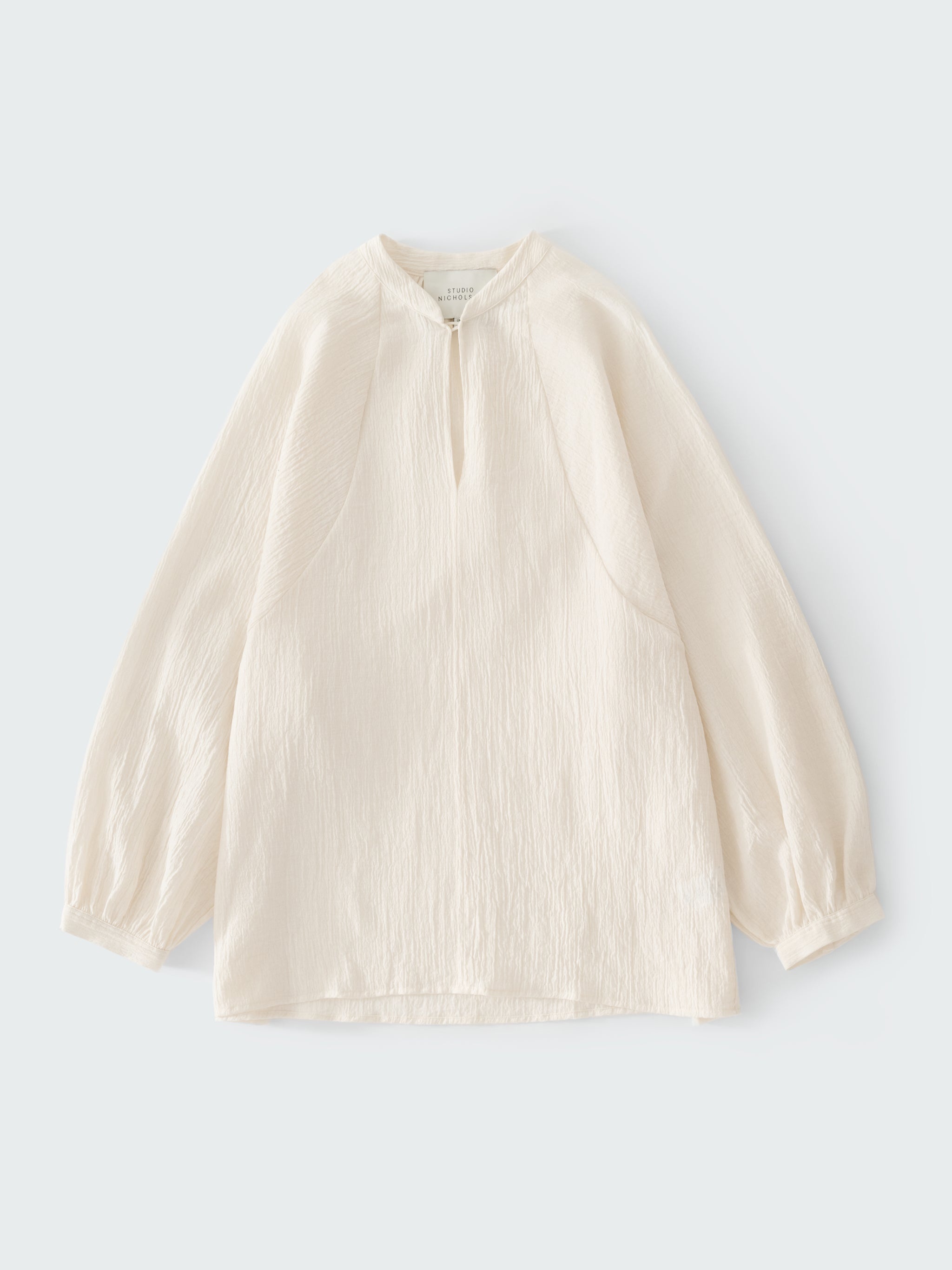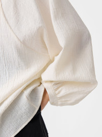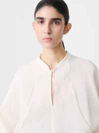 Crafted in a minimal matelasse that falls softly over the body, the Seil is noted for its textured hand feel. Sister to the Blanca dress, it’s shaped with raglan sleeves that accentuate the generous, oversized frame. Seil is constructed with a stand collar, buttoned keyhole and buttoned cuffs – considered nods to classic shirting. DETAILS - Textured fabric - Minimal matelasse - Raglan sleeves - Buttoned keyhole - Buttoned cuffs - Stand collarRebecca is 5’10” / 177.5 cms and wears a size UK8 CARE 74% Cotton 26% Polyamide Do NOT Iron | Dry Clean Made in Portugal