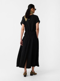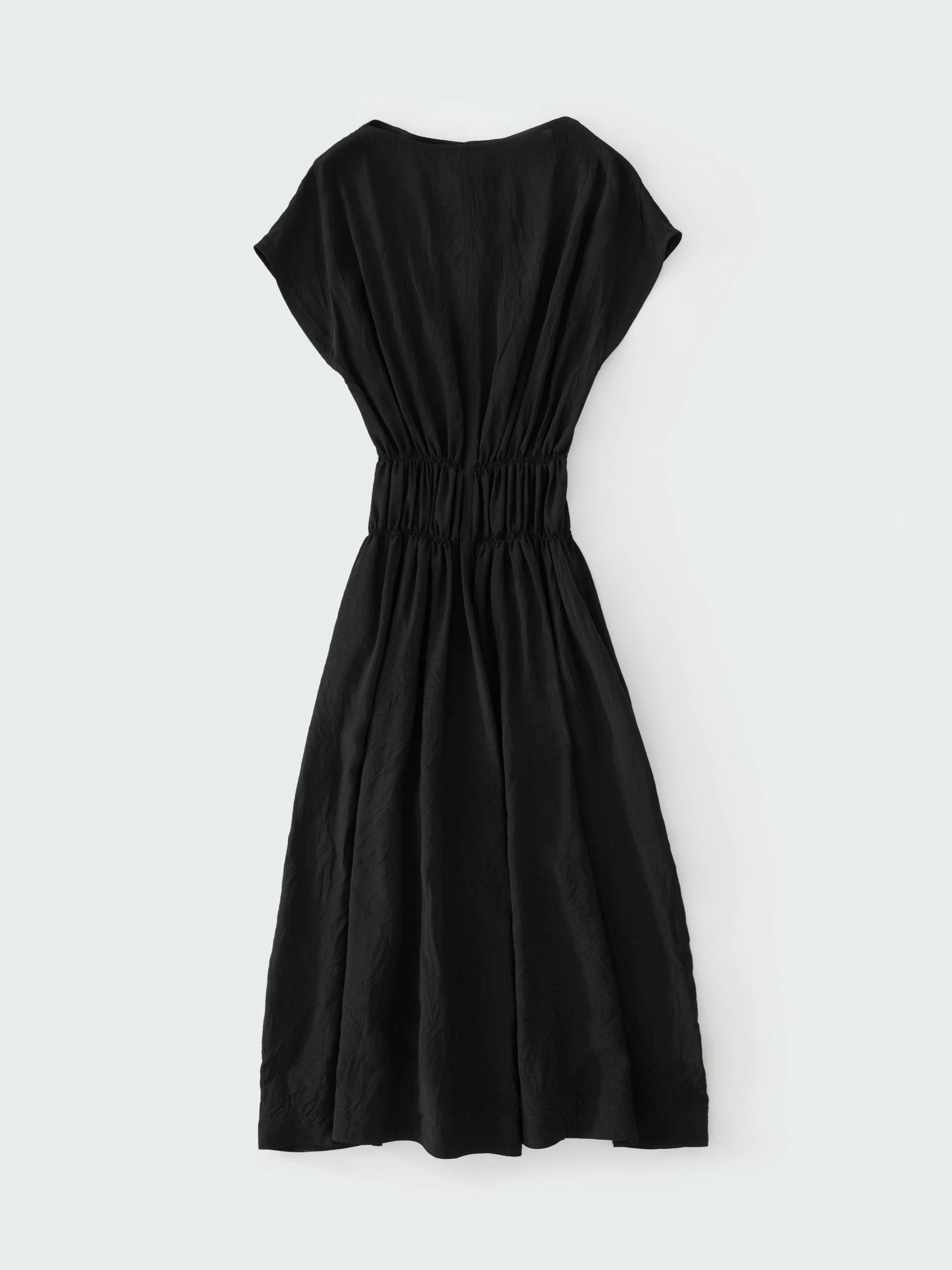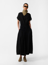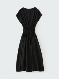 Studio Nicholson’s ‘fabric first’ philosophy is exemplified by this Simos dress. It’s cut from our crushed viscose fabric chosen for its lustrous, softly crushed appearance and effortless drape. The dress is fitted with an elasticated waist and a back vent that work in harmony with the fabric choice to further accentuate the relaxed, fluid silhouette. DETAILS - Elasticated waist - Side slip pockets - Rear neck buttoned opening - Back vent - Please Note: with wear the crease in this fabric will reduce and this should be seen as a characteristic of this material. Nataly is 5'10" / 177 cms and wears a size UK8 CARE 100% Viscose Do NOT Wash | Dry Clean Only Made in Portugal