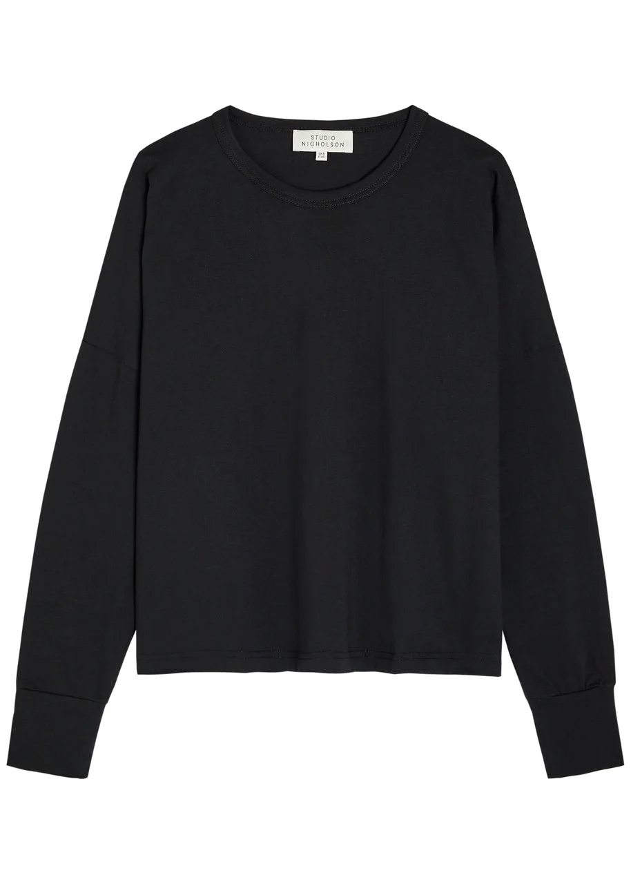 Info & Care Studio Nicholson cotton T-shirt Crew-neck, dropped shoulders, ribbed trims Slips on 100% cotton Machine wash Size & Fit Length shoulder to hem: 22.5 inches/ 57cm Heavyweight Relaxed boxy fit Model is 5'9"/ 175cm and wears a size UK8