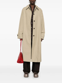 beige cotton blend twill weave concealed front button fastening pointed flat collar long raglan sleeves with belted cuffs two side welt pockets buttoned central rear vent internal patch pocket full lining straight hem long length - Color: NEUTRALS - Made in: Portugal - Designer Style ID: SNW-1620 HOLIN TAN Composition and care Outer Composition Cotton: 64.0%, Lining Composition Cotton: 49.0%, Outer Composition Polyamide: 36.0%, Lining Composition Viscose: 51.0%