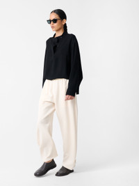 Studio Nicholson brings an elevated feel to the enduring sweatpant silhouette with Thalo. They’re cut from a sponge wool fabric – a double-woven wool noted for its spongy texture and comfortable stretch. Thalo features a contrasting technical nylon waistband and adjustable snap-button hem tabs that accentuate the gentle curve in the leg. DETAILS - Elasticated waistband - Side zip pockets - Adjustable hem tabs - Rear patch pocket - Wear it with the matching Santini ShirtLuana is 5'10" / 178 cms and wears a size UK8 CARE Main Fabric: 96% Virgin Wool 4% Lyocell Trim: 100% Nylon Delicate Dry Clean Only Made in Portugal