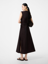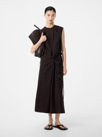 Studio Nicholson brings a clean, modern edge to the enduring column silhouette with Verve. This brown dress is expertly cut from our wool-nylon blend noted for its high shine, crinkled texture, and unassuming fluidity. Constructed to a sleeves profile, Verve is fitted with a waist tie and an inverted pleat, amplifying the fluid frame. DETAILS - Round neck - Waist tie - Back zipQing is 5'10''/ 177 cms and wears a size UK8 CARE 56% Polyamide 44% Wool Delicate Wash at 30°C | Delicate Dry Clean Made in Portugal