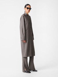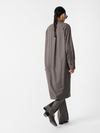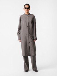 Wheeler is a modern update on the classic shirt dress. It’s cut from tropical wool - an Italian-milled fabric that recalls classic tailoring cloth and chosen here for its breathability and dry, crisp handle. Designed to sit easily on the body, Wheeler is constructed with an extended collar stand detail and an extra-long sleeve pocket, accentuating the fluid silhouette. DETAILS - Extended stand collar detail - Concealed placket - Three-quarter length - Box-pleat yokeLuana is 5'10" / 178 cms and wears a size UK8 CARE 100% Virgin Wool Dry Clean Only Made in Portugal