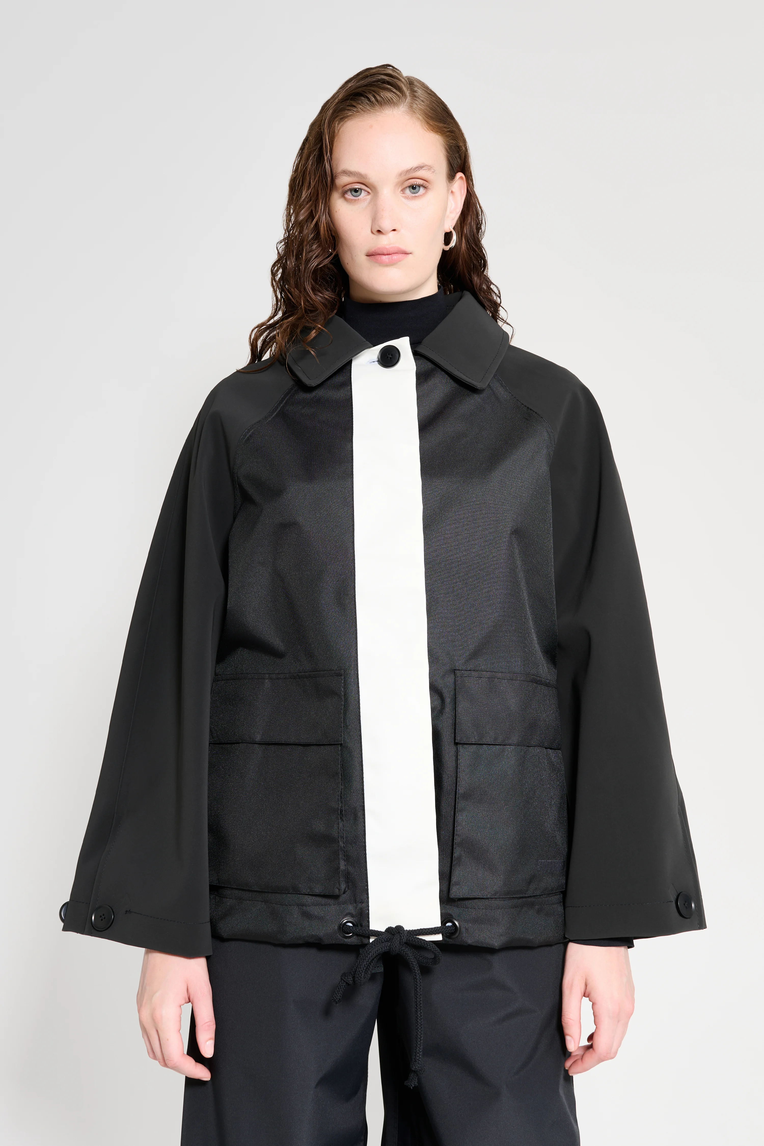 Bandhagen Patch is a varsity-style rain jacket for women. This two-tone, two-texture design has taped inside seams, making it resistant to wind and rain. The body of the garment is made up of a breathable nylon fabric, while the sleeves and collar are made in our classic sturdy and hard-wearing waterproof fabric with a matte finish. The tapered sleeves and relaxed fit add an elegant yet casual look to the style – making it the most stylish raincoat imaginable. The model is 176 cm / 5′ 8″ Wearing → SIZE S GARMENT DETAILS Heavyweight 530-gram fabric (sleeves and collar) Breathable woven nylon fabric (body) Wind and water-resistant Relaxed fit Hip-length Raglan sleeve construction Hidden button front fastening Patch pockets Debossed logo at back of collar Taped inside seams Designed in Stockholm Made in Europe MATERIAL Sleeves & collar: Coating: 100% PVC rubberized coating Membrane: 52% cotton, 48% polyester Body: 100% polyester Read more about our fabrics