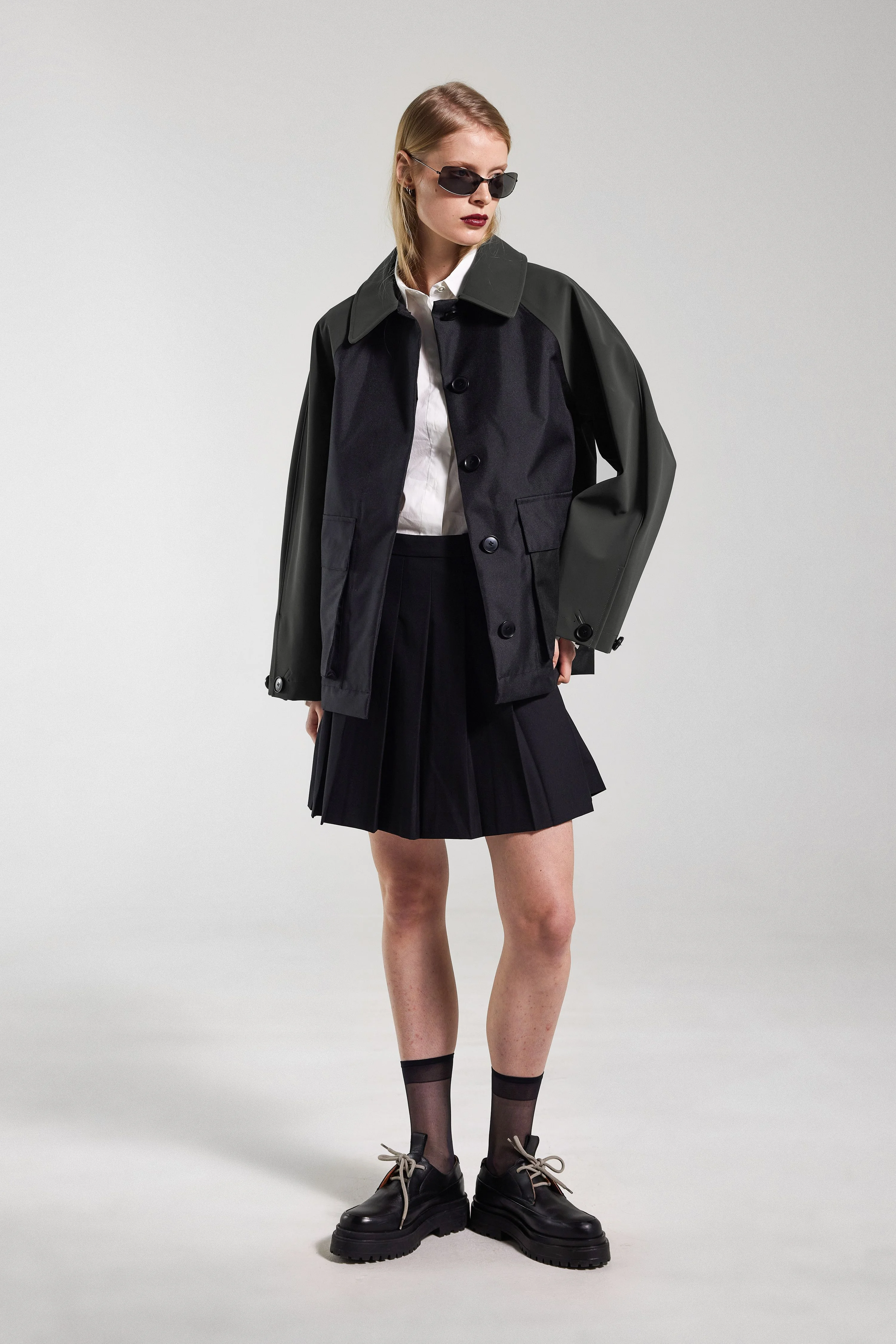 Bandhagen Patch is a varsity-style rain jacket for women. This two-tone, two-texture design has taped inside seams, making it resistant to wind and rain. The body of the garment is made up of a breathable nylon fabric, while the sleeves and collar are made in our classic sturdy and hard-wearing waterproof fabric with a matte finish. The tapered sleeves and relaxed fit add an elegant yet causal look to the style – making it the most stylish raincoat imaginable. The model is 175 cm / 5′ 9” Wearing → SIZE S GARMENT DETAILS • Heavyweight 530-gram fabric (sleeves and collar) • Breathable woven nylon fabric (body) • Wind and water-resistant • Relaxed fit • Hip-length • Raglan sleeve construction • Hidden button front fastening • Patch pockets • Debossed logo at back of collar • Taped inside seams • Designed in Stockholm • Made in Europe MATERIAL Sleeves & collar: Coating: 100% PVC rubberized coating Membrane: 52% cotton, 48% polyester Body: 100% polyester Read more about our fabrics