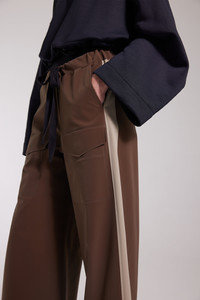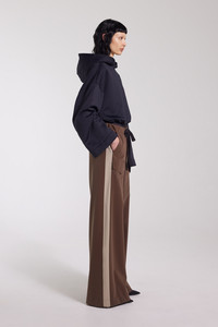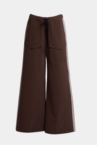 Jarla Stripe are coverall trousers for women in light and airy waterproof fabric with a matte finish and a contrast-coloured stripe down the side of each leg. Constructed with double-welded seams for complete rain protection, these trousers are perfect for staying stylish in wet weather. The high drawstring waist and wide leg add femininity and ease of movement as well as making the trousers quick and easy to transition in and out of. The front patch pocket on each leg and slanted single back pocket with an aqua guard zipper add practicality as well as a stylish touch. The model is 176 cm / 5′ 8″ Wearing → SIZE M GARMENT DETAILS • Lightweight 230-gram fabric • Matte-textured finish • Completely waterproof • High-waist with elasticated hem • Wide leg • Double-welded seams • Front patch pocket on each leg • Open side pockets • Slanted single back pocket with aqua guard zipper • +20 000 mm water column pressure • Designed in Stockholm • Made in Europe MATERIAL Coating: 100% PVC rubberized coating Membrane: 100% polyester Read more about our fabrics