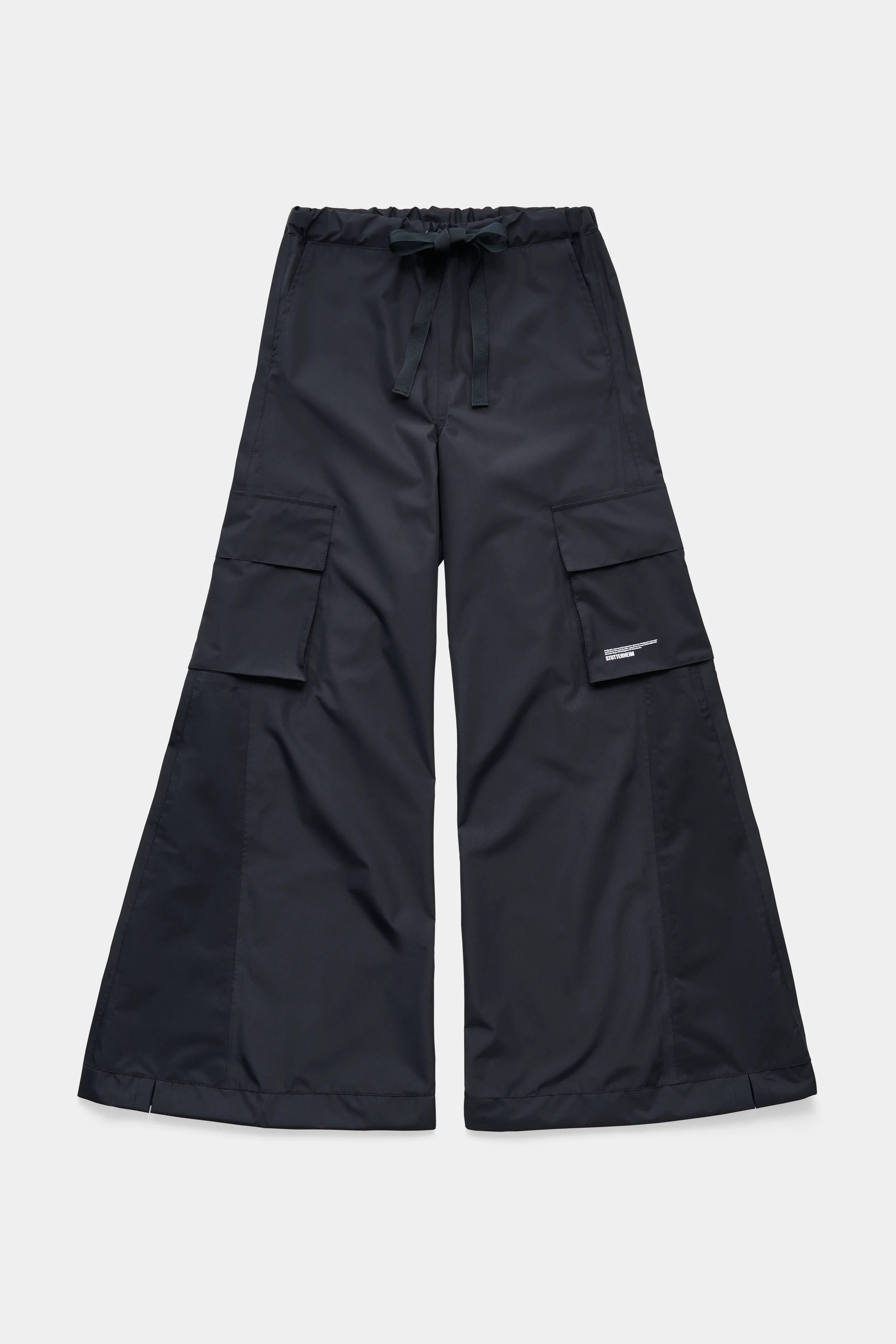 Karla Pocket Lightweight are flared trousers for women in a light and breathable nylon fabric. These high-waist trousers have taped inside seams, making them resistant to wind and rain. The wide legs are decorated with large patch pockets on each thigh, offering both functionality and a style statement. The model is 176 cm / 5′ 8″ Wearing → SIZE S GARMENT DETAILS - Breathable woven nylon fabric - Taped seams - Completely waterproof - High-waist with elasticated hem - Flared leg - Tripple-welded seams - Side pockets with velcro closure + pinted logo artwork - Slanted single back pocket with aqua guard zipper - +20 000 mm water column pressure - Designed in Stockholm - Made in Europe MATERIAL Coating: 100% Polyester Membrane: 100% thermoplastic elastomer Read more about our fabrics