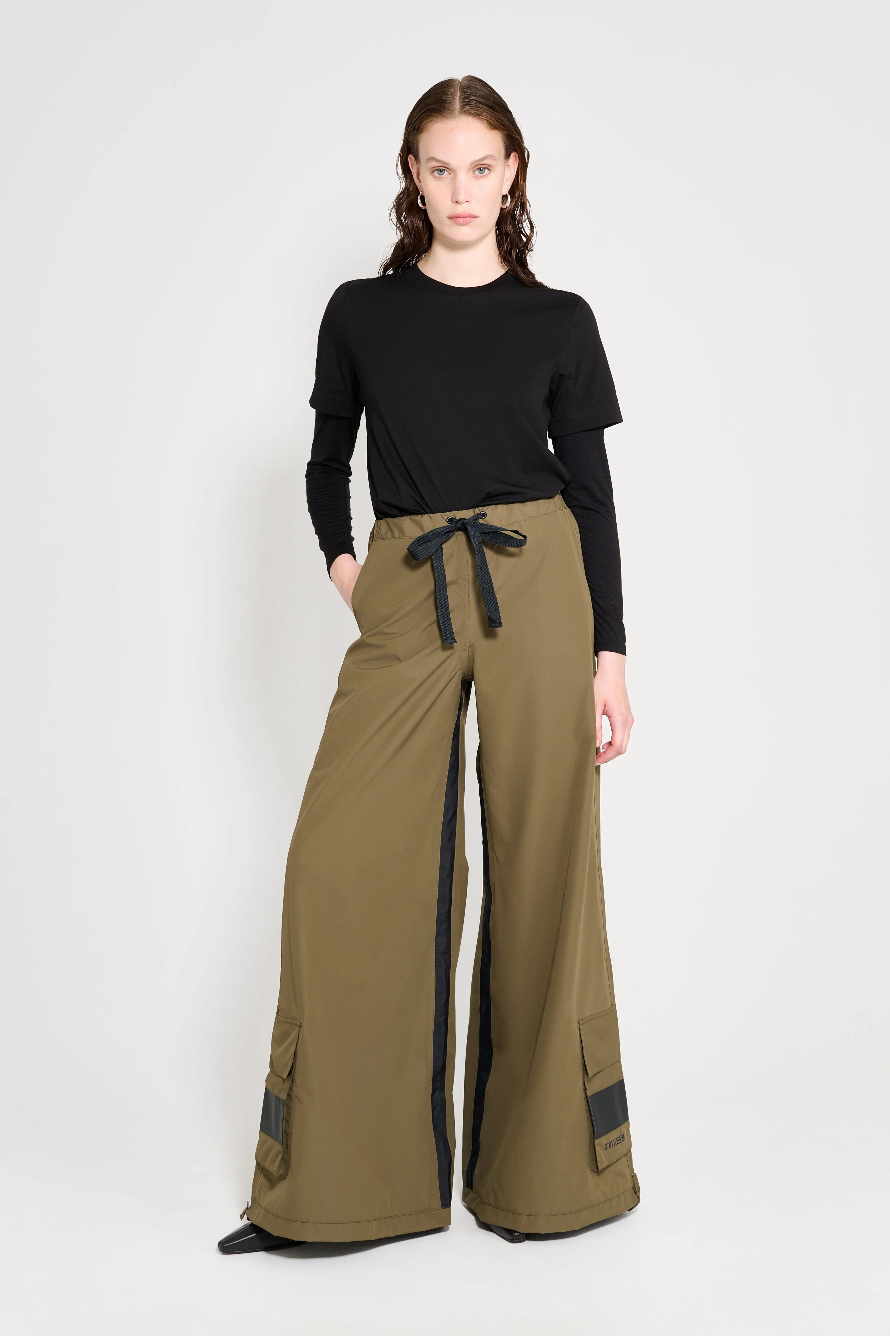 Karla Pocket are flared trousers for women in a light and breathable nylon fabric. These high-waist trousers have taped inside seams, making them resistant to wind and rain. The wide legs are decorated with colour-block detailing on the lower leg patch pockets, offering both functionality and a style statement. The model is 176 cm / 5′ 8″ Wearing → SIZE S GARMENT DETAILS - Breathable woven nylon fabric - Wind and water-resistant - High-waist with elasticated hem - Flared legs - Patch pocket with colour-block detail on lower leg - Taped inside seams - Open side pockets - Slanted zipped back pocket - Designed in Stockholm - Made in Europe MATERIAL Coating: 100% Polyester Membrane: 100% thermoplastic elastomer Read more about our fabrics