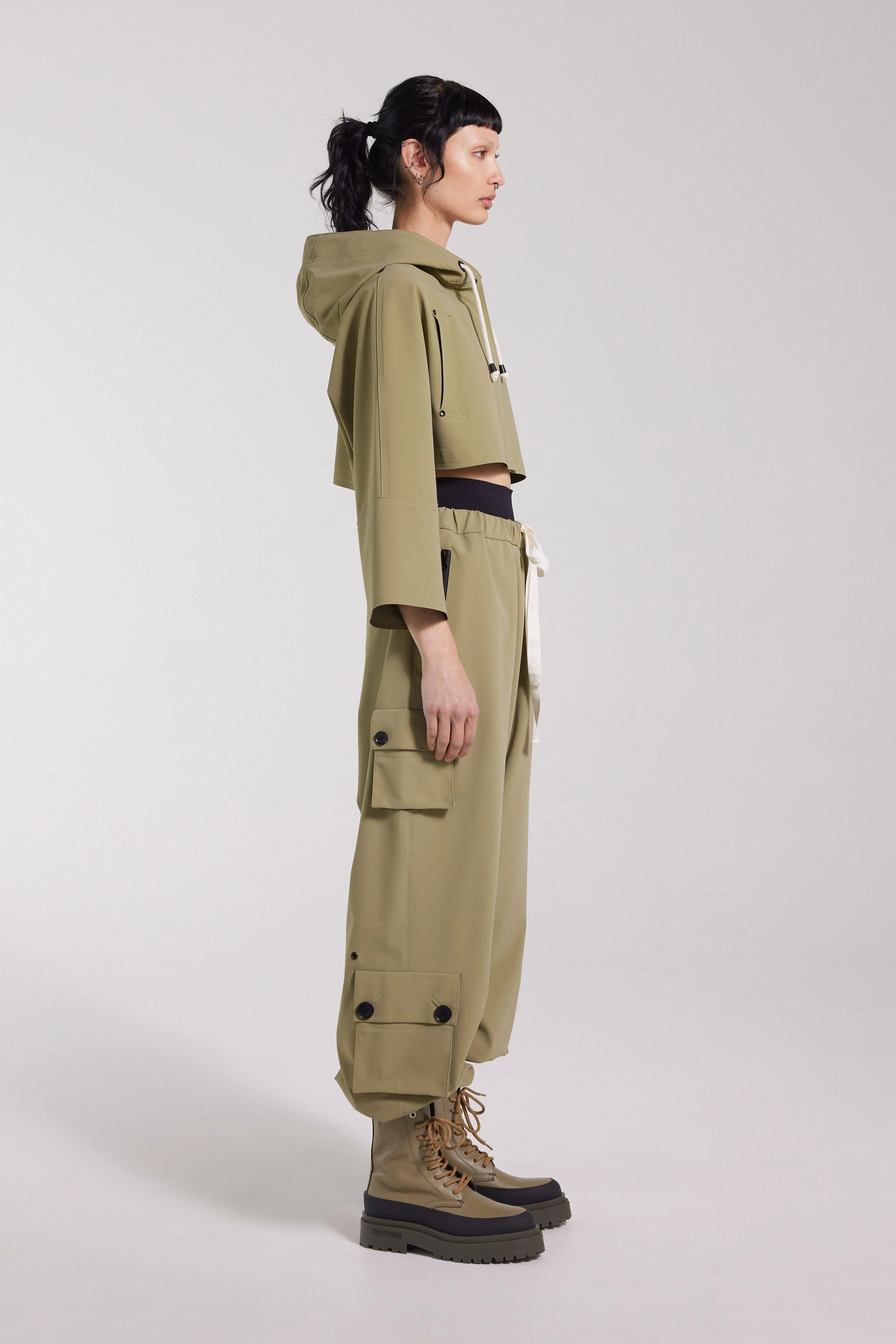 Lilla Tre is a super cropped hooded raincoat for women in sturdy waterproof fabric that is crafted with double-welded seams, making it impossible for any moisture to seep through. This short and stylish piece is perfect for layering and to pair with one of our high-waisted rain trousers for a completely waterproof yet fashionable look. The model is 176 cm / 5′ 8″ Wearing → SIZE S GARMENT DETAILS - Heavyweight 530-gram fabric - Completely waterproof - Wide bell sleeves - Seamless shoulder construction - Cropped body length - Drawstring hood with chunky cotton laces - Hidden press buttons - Open side pockets - Under-arm eyelets for ventilation - +20 000 mm water column pressure - Designed in Stockholm - Made in Europe MATERIAL Coating: 100% PVC rubberized coating Membrane: 52% Cotton, 48% polyester Read more about our fabrics