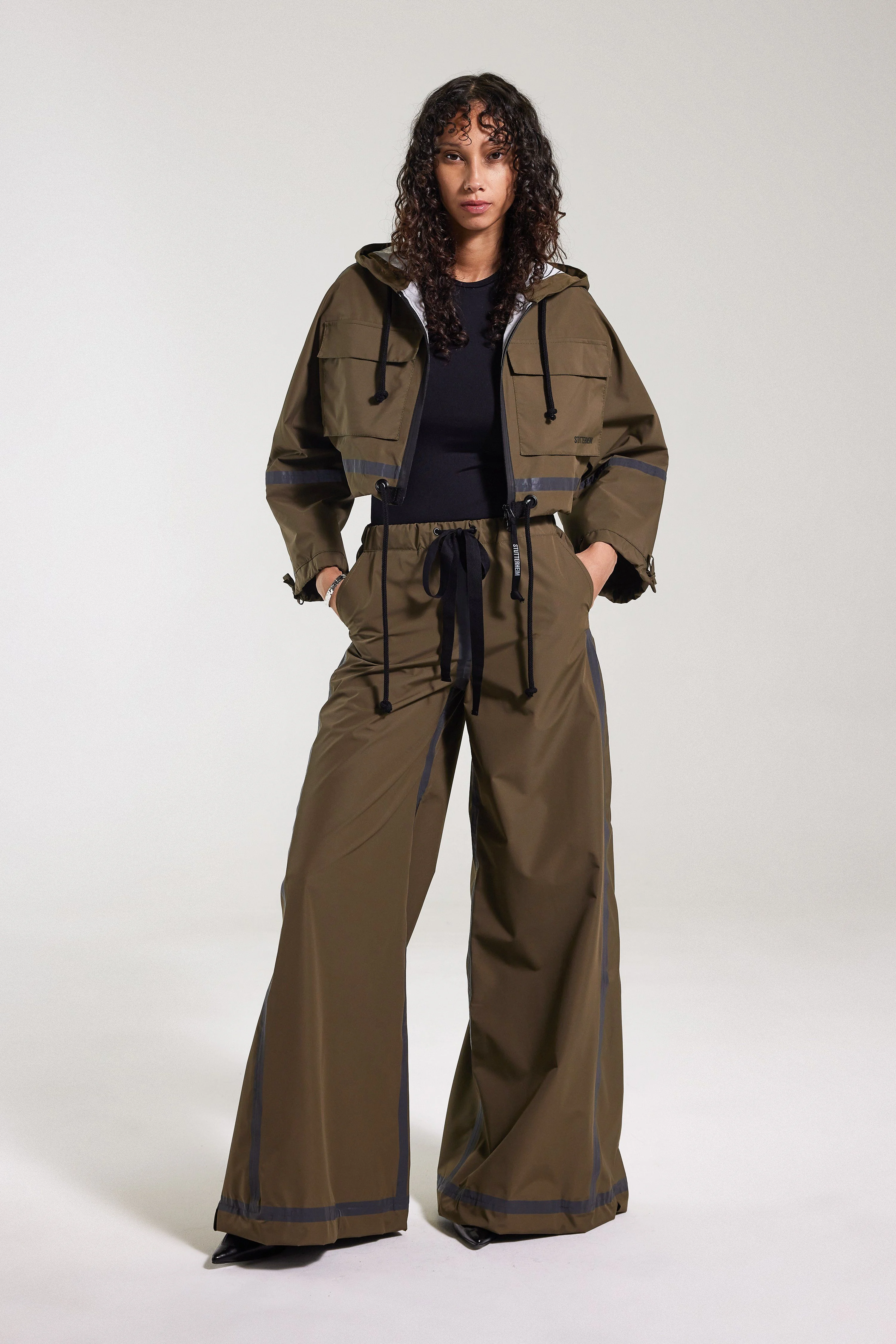 Lilla Tre Tape is a super cropped hooded rain jacket for women in light and breathable water-resistant fabric. This short and stylish piece is perfect for layering and to pair with one of our high-waisted rain trousers for a waterproof and fashionable look. The decorative reflective taped seams add both functionality and style. The model is 174 cm / 5′ 9” Wearing → SIZE S GARMENT DETAILS - Lightweight nylon fabric - Water-resistant - Breathable - Cropped body length - Wide bell sleeves - Decorative reflective tape-detailing - Drawstring hood with chunky cotton laces - Chunky laced drawstring at waist hem - Aquaguard front zip - Two front patch pockets - Extra large under-arm eyelets for ventilation - Seamless shoulder construction - +20 000 mm water column pressure (?) - Designed in Stockholm - Made in Europe MATERIAL Coating: 100% polyester Membrane: 100% thermoplastic elastomer Read more about our fabrics