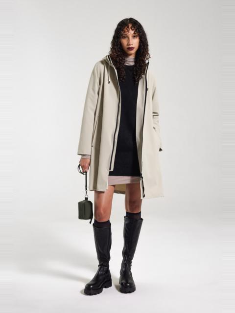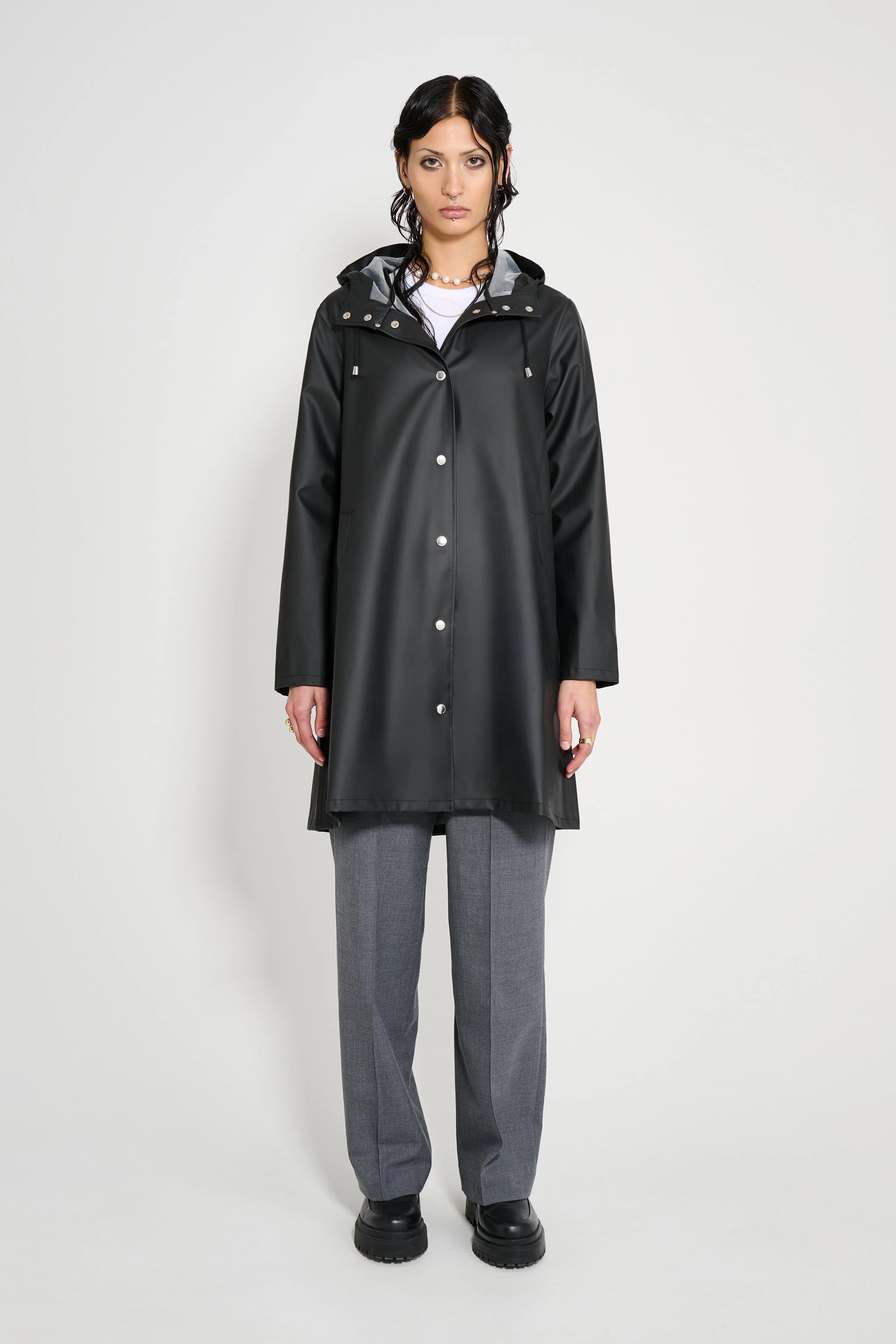 Mosebacke Lightweight is an artisanally made a-line-shaped raincoat for women. The ultra-light waterproof fabric is tailored with double-welded seams, making it impossible for any moisture to seep through. Ease of movement and comfort is achieved with under-arm eyelets and a drawstring hood. The thin and packable fabric makes this garment perfect in unpredictable weather and for travelling. The model is 179 cm / 5′ 10″ Wearing → SIZE S GARMENT DETAILS - Lightweight 230-gram fabric - Packable - Completely waterproof - A-line silhouette - Snap metal button closures - Drawstring hood - Open welt pockets - Double welded seams - Under-arm eyelets for ventilation - +20 000 mm water column pressure - Designed in Stockholm - Made in Europe MATERIAL Coating: 100% PVC rubberized coating Membrane: 100% polyester Read more about our fabrics