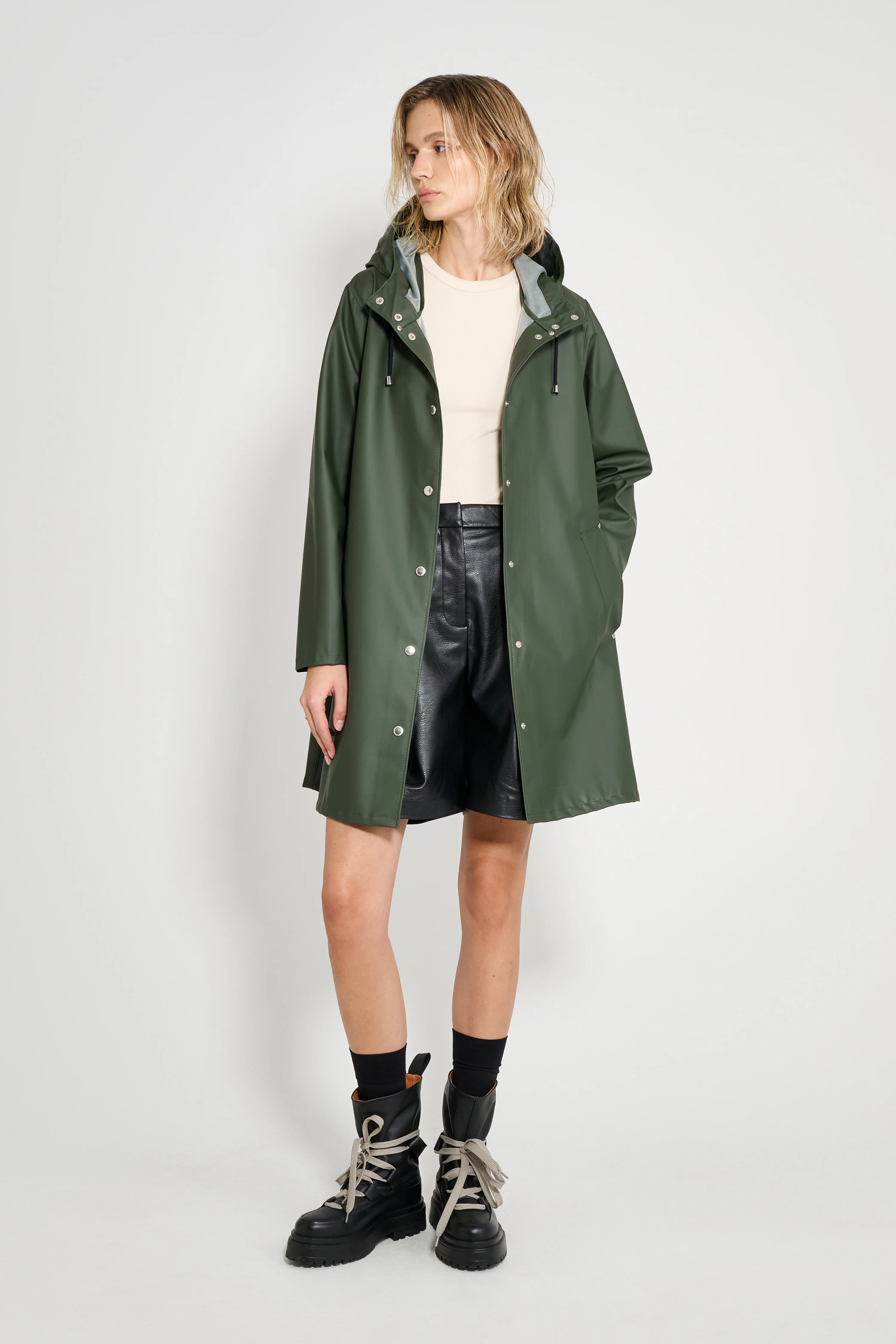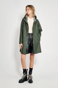 Mosebacke Lightweight is an artisanally made a-line-shaped raincoat for women. The ultra-light waterproof fabric is tailored with double-welded seams, making it impossible for any moisture to seep through. Ease of movement and comfort is achieved with under-arm eyelets and a drawstring hood. The thin and packable fabric makes this garment perfect in unpredictable weather and for travelling. The model is 179 cm / 5′ 10″ Wearing → SIZE S GARMENT DETAILS - Lightweight 230-gram fabric - Packable - Completely waterproof - A-line silhouette - Snap metal button closures - Drawstring hood - Open welt pockets - Double welded seams - Under-arm eyelets for ventilation - +20 000 mm water column pressure - Designed in Stockholm - Made in Europe MATERIAL Coating: 100% PVC rubberized coating Membrane: 100% polyester Read more about our fabrics