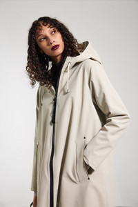 Mosebacke Lightweight Zip is an artisanally made a-line-shaped raincoat for women. The ultra-light waterproof fabric is tailored with double-welded seams and equipped with an aqua guard zipper, making it impossible for any moisture to seep through. Ease of movement and comfort is achieved with under-arm eyelets and a drawstring hood. The thin and packable fabric makes this garment perfect in unpredictable weather and for travelling. The model is 174 cm / 5′ 9” Wearing → SIZE S GARMENT DETAILS - Lightweight 230-gram fabric - Packable - Completely waterproof - A-line silhouette - Aqua guard zipper - Drawstring hood - Open welt pockets - Double welded seams - Under-arm eyelets for ventilation - +20 000 mm water column pressure - Designed in Stockholm - Made in Europe MATERIAL Coating: 100% PVC rubberized coating Membrane: 100% polyester Read more about our fabrics
