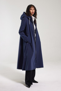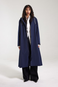 Mosebacke Long Matte Zip is an artisanally made knee-length and a-line-shaped raincoat for women. The ultra-light waterproof fabric with a matte finsh is tailored with double-welded seams and equipped with an aqua guard zipper, making it impossible for any moisture to seep through. Ease of movement and comfort is achieved with under-arm eyelets and a drawstring hood. The thin and packable fabric makes this garment perfect in unpredictable weather and for travelling. The model is 174 cm / 5′ 9” Wearing → SIZE S GARMENT DETAILS • Lightweight 230-gram fabric • Matte-textured finish • Packable • Completely waterproof • A-line silhouette • Calf-length • Aqua guard zipper • Drawstring hood • Open welt pockets • Double welded seams • Under-arm eyelets for ventilation • +20 000 mm water column pressure • Designed in Stockholm • Made in Europe MATERIAL Coating: 100% PVC rubberized coating Membrane: 100% polyester Read more about our fabrics