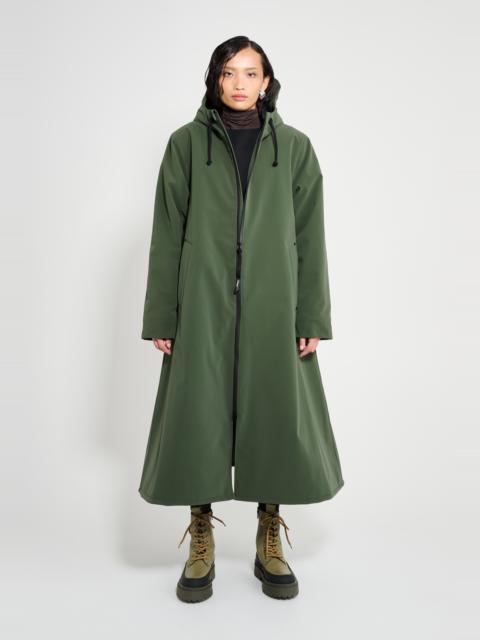 Mosebacke Long Winter Matte is an artisanally made knee-length and a-line-shaped warm raincoat for women. The sturdy and hard-wearing waterproof shell fabric has a matte-textured finish and is tailored with double-welded seams, making it impossible for any moisture to seep through, while the padding provides warmth during cold and snowy weather. Ease of movement and comfort is achieved with knitted wristlets and a drawstring hood. GARMENT DETAILS • Midweight 280-gram shell fabric • Matte-textured finish • Completely waterproof • 150-gram technical insulator filling • Polyester lining • A-line silhouette • Knee-length • Aqua guard zipper • Nylon logo pull tab • Drawstring hood • Knitted wristlets • Fleece-lined welt side pockets • Fleece-lined inside welt pocket • Double welded seams • +20 000 mm water column pressure • Designed in Stockholm • Made in Europe MATERIAL Coating: 100% PVC rubberized coating Membrane: 100% polyester Lining: 100% polyester with poly filling Read more about our fabrics