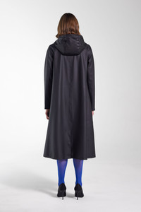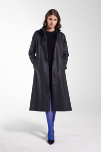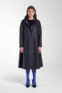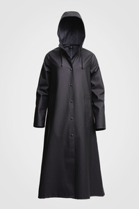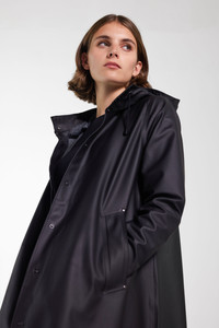 Mosebacke Long is an artisanally made knee-length and a-line-shaped raincoat for women. The sturdy and hard-wearing waterproof fabric is tailored with double-welded seams, making it impossible for any moisture to seep through. Ease of movement and comfort is achieved with under-arm eyelets and a drawstring hood. GARMENT DETAILS • Mid-weight 380-gram fabric • Completely waterproof • A-line silhouette • Knee-length • Snap metal button closures • Drawstring hood • Open welt pockets • Double welded seams • Under-arm eyelets for ventilation • +20 000 mm water column pressure • Designed in Stockholm • Made in Europe MATERIAL Coating: 100% PVC rubberized coating Membrane: 52% cotton, 48% polyester Read more about our fabrics