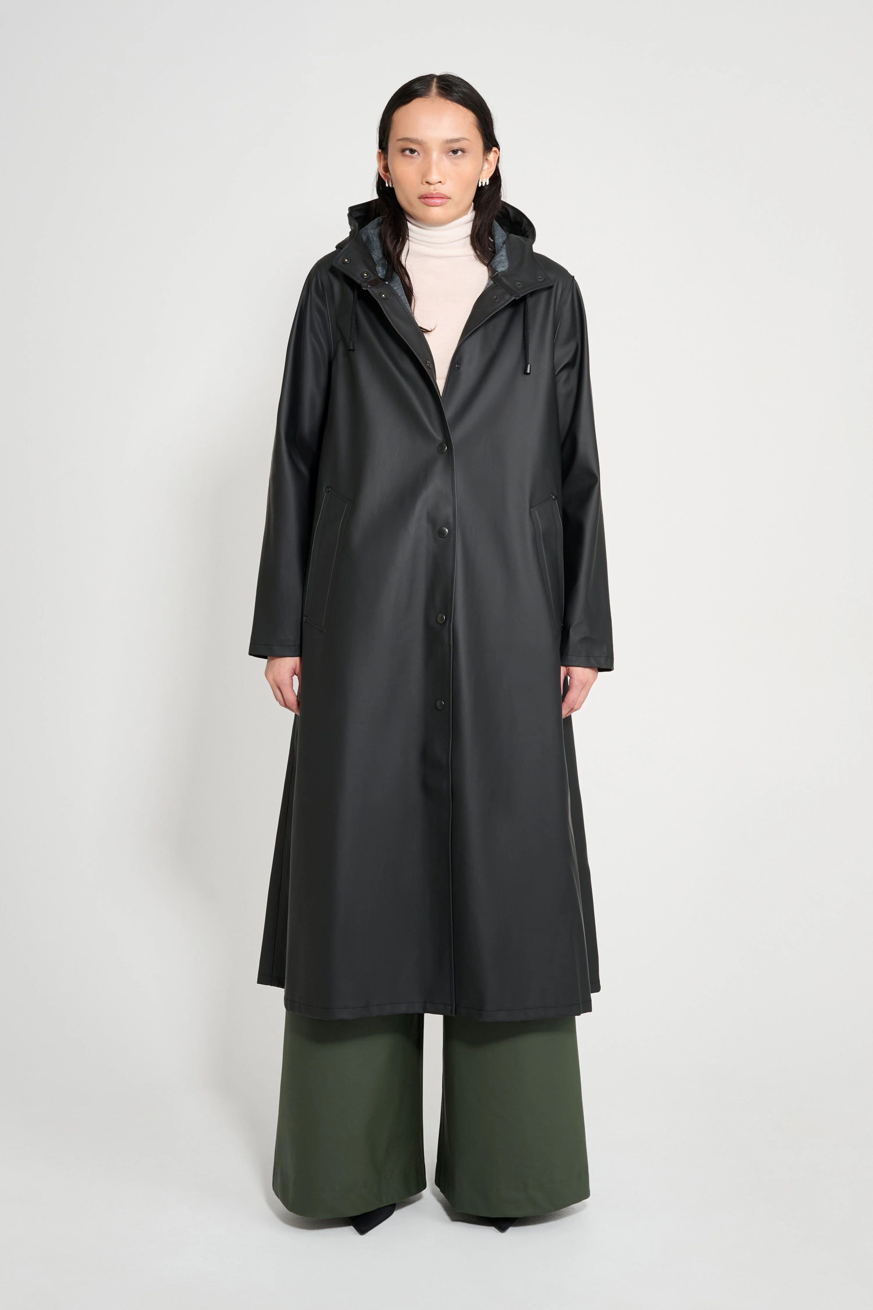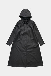 Mosebacke Long is an artisanally made knee-length and a-line-shaped raincoat for women. The sturdy and hard-wearing waterproof fabric is tailored with double-welded seams, making it impossible for any moisture to seep through. Ease of movement and comfort is achieved with under-arm eyelets and a drawstring hood. GARMENT DETAILS - Mid-weight 380-gram fabric - Completely waterproof - A-line silhouette - Calf-length - Snap metal button closures - Drawstring hood - Open welt pockets - Double welded seams - Under-arm eyelets for ventilation - +20 000 mm water column pressure - Designed in Stockholm - Made in Europe MATERIAL Coating: 100% PVC rubberized coating Membrane: 52% cotton, 48% polyester Read more about our fabrics