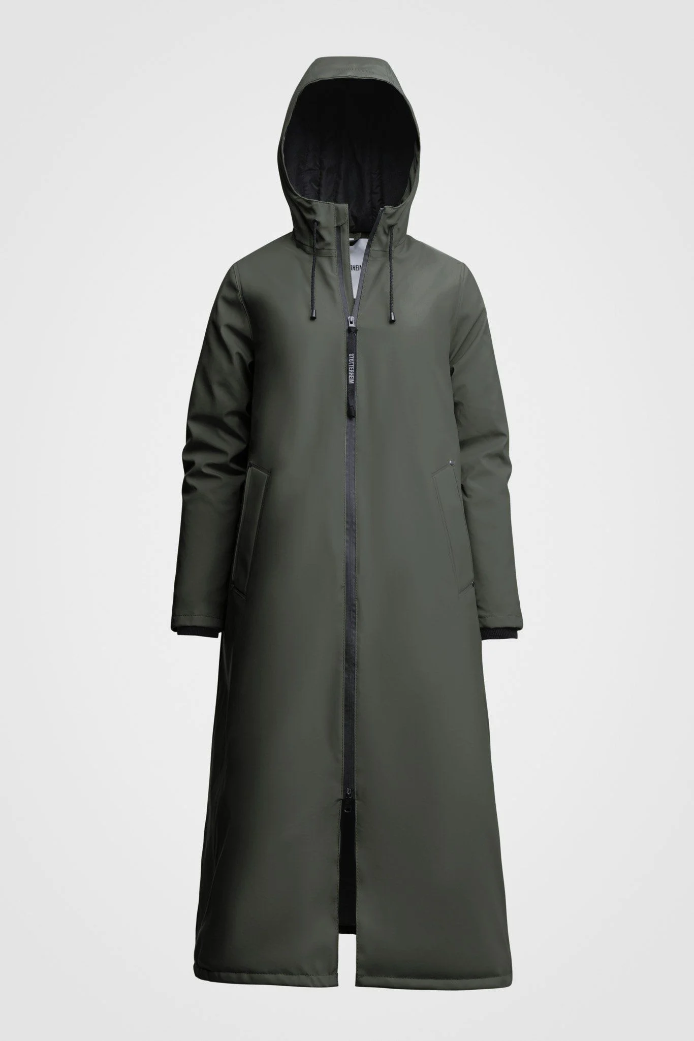 Mosebacke Long Winter is an artisanally made knee-length and a-line-shaped warm raincoat for women. The sturdy and hard-wearing waterproof shell fabric is tailored with double-welded seams, making it impossible for any moisture to seep through, while the padding provides warmth during cold and snowy weather. Ease of movement and comfort is achieved with knitted wristlets and a drawstring hood. GARMENT DETAILS • Mid-weight 280-gram shell fabric • Completely waterproof • 150-gram technical insulator filling • Polyester lining • A-line silhouette • Knee-length • Aqua guard zipper • Nylon logo pull tab • Drawstring hood • Knitted wristlets • Fleece-lined welt side pockets • Fleece-lined inside welt pocket • Double welded seams • +20 000 mm water column pressure • Designed in Stockholm • Made in Europe MATERIAL Coating: 100% PVC rubberized coating Membrane: 100% polyester Lining: 100% polyester with poly filling