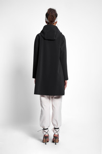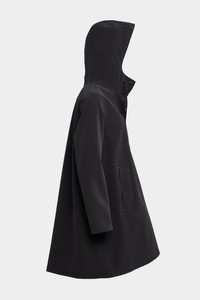 Mosebacke Matte is an artisanally made a-line-shaped raincoat for women. The matte textured finish waterproof fabric is tailored with double-welded seams, making it impossible for any moisture to seep through. Ease of movement and comfort is achieved with under-arm eyelets and a drawstring hood. The model is 178 cm / 5′ 10″ Wearing → SIZE S GARMENT DETAILS - Heavyweight 530-gram fabric - Matte textured finish - Completely waterproof - A-line silhouette - Snap metal button closures - Drawstring hood - Open welt pockets - Double welded seams - Under-arm eyelets for ventilation - +20 000 mm water column pressure - Designed in Stockholm - Made in Europe MATERIAL Coating: 100% PVC rubberized coating Membrane: 52% cotton, 48% polyester Read more about our fabrics