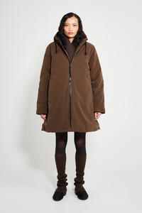 Mosebacke Winter Matte is an artisanally made a-line-shaped warm raincoat for women. The sturdy and hard-wearing waterproof shell fabric has a matte-textured finish and is tailored with double-welded seams, making it impossible for any moisture to seep through, while the padding provides warmth during cold and snowy weather. Ease of movement and comfort is achieved with knitted wristlets and a drawstring hood. GARMENT DETAILS • Midweight 280-gram shell fabric • Matte-textured finish • Completely waterproof • 150-gram technical insulator filling • Polyester lining • A-line silhouette • Aqua guard zipper • Nylon logo pull tab • Drawstring hood • Knitted wristlets • Fleece-lined welt side pockets • Fleece-lined inside welt pocket • Double welded seams • +20 000 mm water column pressure • Designed in Stockholm • Made in Europe MATERIAL Coating: 100% PVC rubberized coating Membrane: 100% polyester Lining: 100% polyester with poly filling Read more about our fabrics