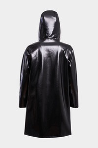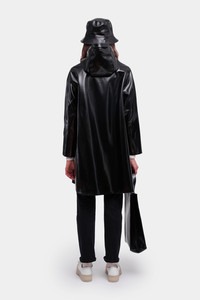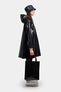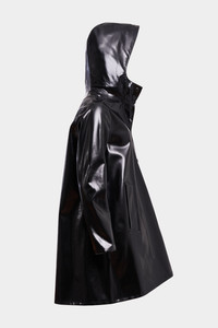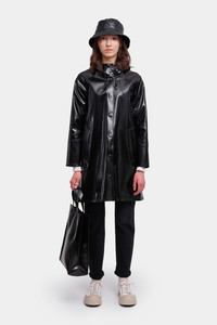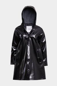 Mosebacke Opal is an artisanally made a-line-shaped raincoat for women. The shiny yet sturdy waterproof fabric is tailored with double-welded seams, making it impossible for any moisture to seep through. Ease of movement and comfort is achieved with under-arm eyelets and a drawstring hood. The model is 177 cm / 5′ 10″ Wearing → SIZE S GARMENT DETAILS • Heavy-weight 530-gram fabric • Shiny high-gloss fabric finish • Completely waterproof • A-line silhouette • Snap metal button closures • Drawstring hood • Open welt pockets • Double welded seams • Under-arm eyelets for ventilation • +20 000 mm water column pressure • Designed in Stockholm • Made in Europe MATERIAL Coating: 100% PVC rubberized coating Membrane: 52% cotton, 48% polyester Read more about our fabrics