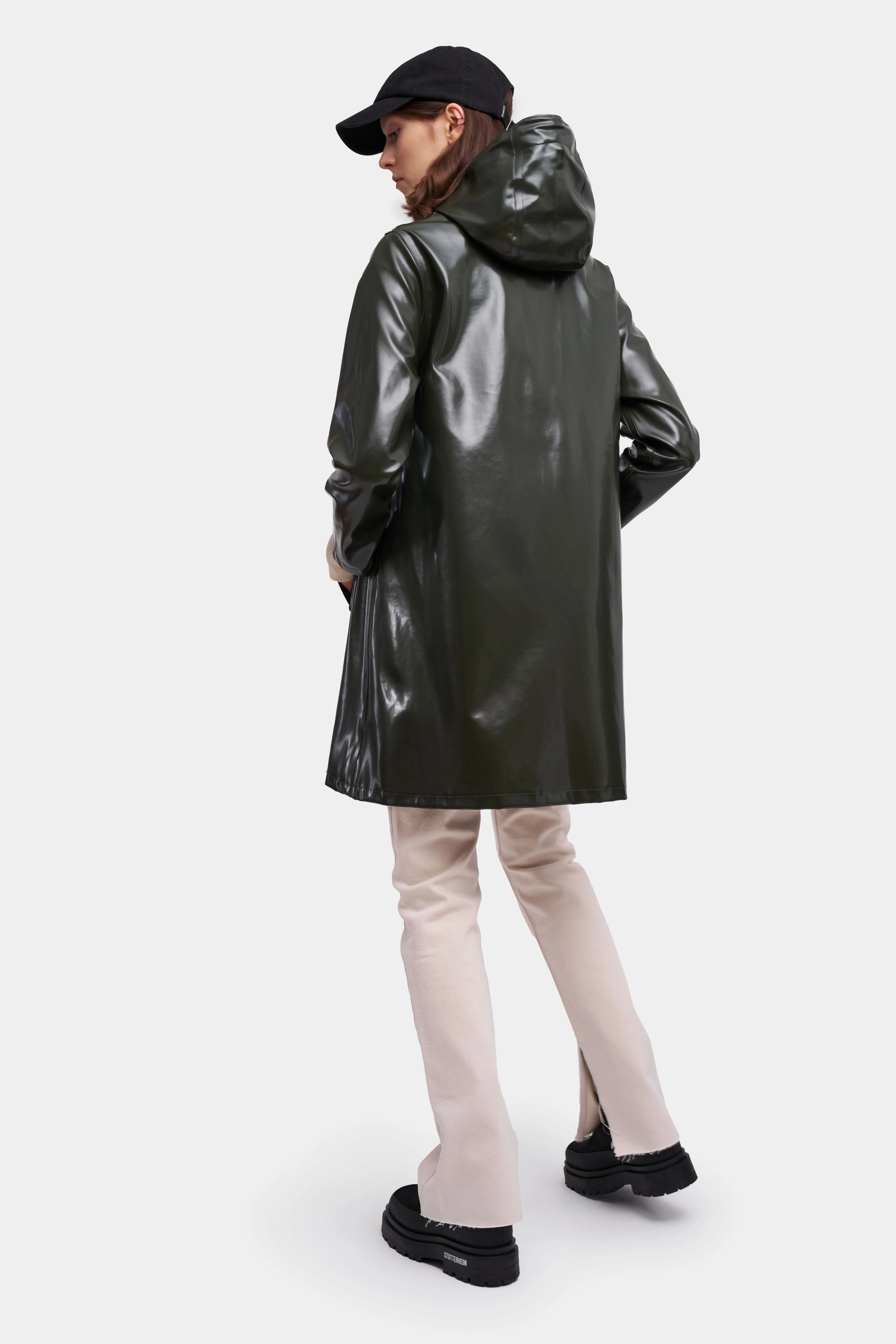 Mosebacke Opal is an artisanally made a-line-shaped raincoat for women. The shiny yet sturdy waterproof fabric is tailored with double-welded seams, making it impossible for any moisture to seep through. Ease of movement and comfort is achieved with under-arm eyelets and a drawstring hood. The model is 177 cm / 5′ 10″ Wearing → SIZE S GARMENT DETAILS • Heavy-weight 530-gram fabric • Shiny high-gloss fabric finish • Completely waterproof • A-line silhouette • Snap metal button closures • Drawstring hood • Open welt pockets • Double welded seams • Under-arm eyelets for ventilation • +20 000 mm water column pressure • Designed in Stockholm • Made in Europe MATERIAL Coating: 100% PVC rubberized coating Membrane: 52% cotton, 48% polyester Read more about our fabrics