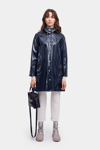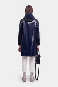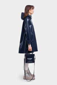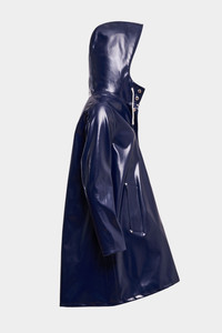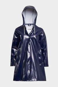 Mosebacke Opal is an artisanally made a-line-shaped raincoat for women. The shiny yet sturdy waterproof fabric is tailored with double-welded seams, making it impossible for any moisture to seep through. Ease of movement and comfort is achieved with under-arm eyelets and a drawstring hood. The model is 177 cm / 5′ 10″ Wearing → SIZE S GARMENT DETAILS • Heavy-weight 530-gram fabric • Shiny high-gloss fabric finish • Completely waterproof • A-line silhouette • Snap metal button closures • Drawstring hood • Open welt pockets • Double welded seams • Under-arm eyelets for ventilation • +20 000 mm water column pressure • Designed in Stockholm • Made in Europe MATERIAL Coating: 100% PVC rubberized coating Membrane: 52% cotton, 48% polyester Read more about our fabrics