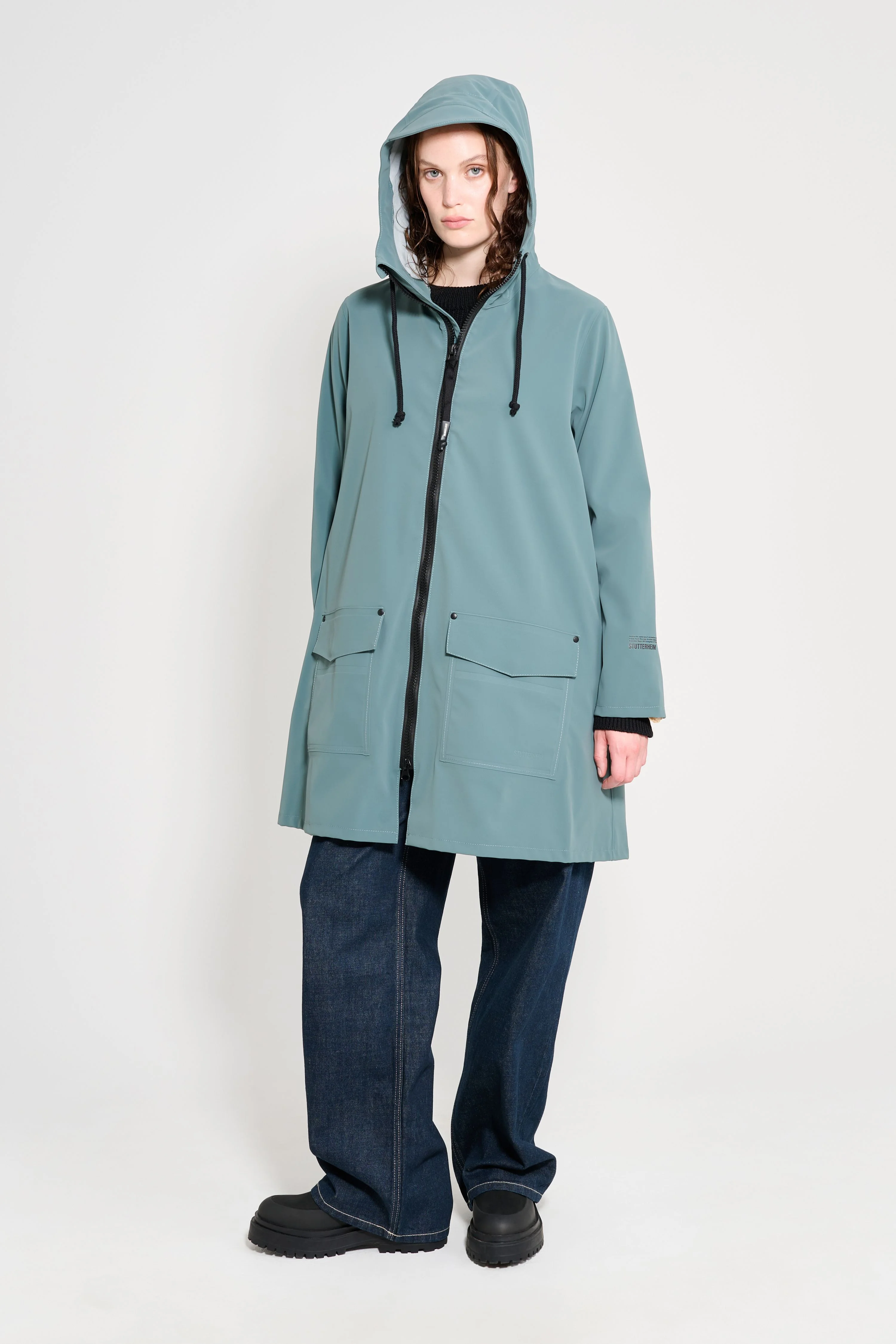 Meet Mosebacke 2.0. Based on our classic style Mosebacke, this version of the A-lined raincoat for women boasts of all the features that make the original an essential wardrobe staple, while incorporating new and improved features based on customer feedback. Expertly made in light and airy waterproof fabric and tailored with triple-welded seams to keep any moisture from seeping through, the new features include patch pockets with flaps to keep your valuables dry and safe as well as a capped hood for clear vision and perfect hair, even in less than perfect weather. GARMENT DETAILS • Lightweight 280-gram fabric • Packable • Completely waterproof • A-line silhouette • Heavy acrylic zipper • Capped drawstring hood • Chunky cotton drawstrings • Patch pockets with flaps • Triple-welded seams • Under-arm eyelets for ventilation • +20 000 mm water column pressure • Designed in Stockholm • Made in Europe MATERIAL Coating: 100% PVC rubberized coating Membrane: 100% polyester Read more about our fabrics