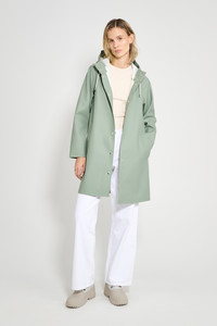 Mosebacke, a hilltop overlooking Stockholm and your top wardrobe staple, is an artisanally made a-line-shaped raincoat for women. The sturdy and hard-wearing waterproof fabric is tailored with double-welded seams, making it impossible for any moisture to seep through. Ease of movement and comfort is achieved with under-arm eyelets and a drawstring hood. The model is 177 cm / 5' 8″ Wearing → SIZE S GARMENT DETAILS - Heavy-weight 530-gram fabric - Completely waterproof - A-line silhouette - Snap metal button closures - Drawstring hood - Open welt pockets - Double welded seams - Under-arm eyelets for ventilation - +20 000 mm water column pressure - Designed in Stockholm - Made in Europe MATERIAL Coating: 100% PVC rubberized coating Membrane: 52% cotton, 48% polyester Read more about our fabrics