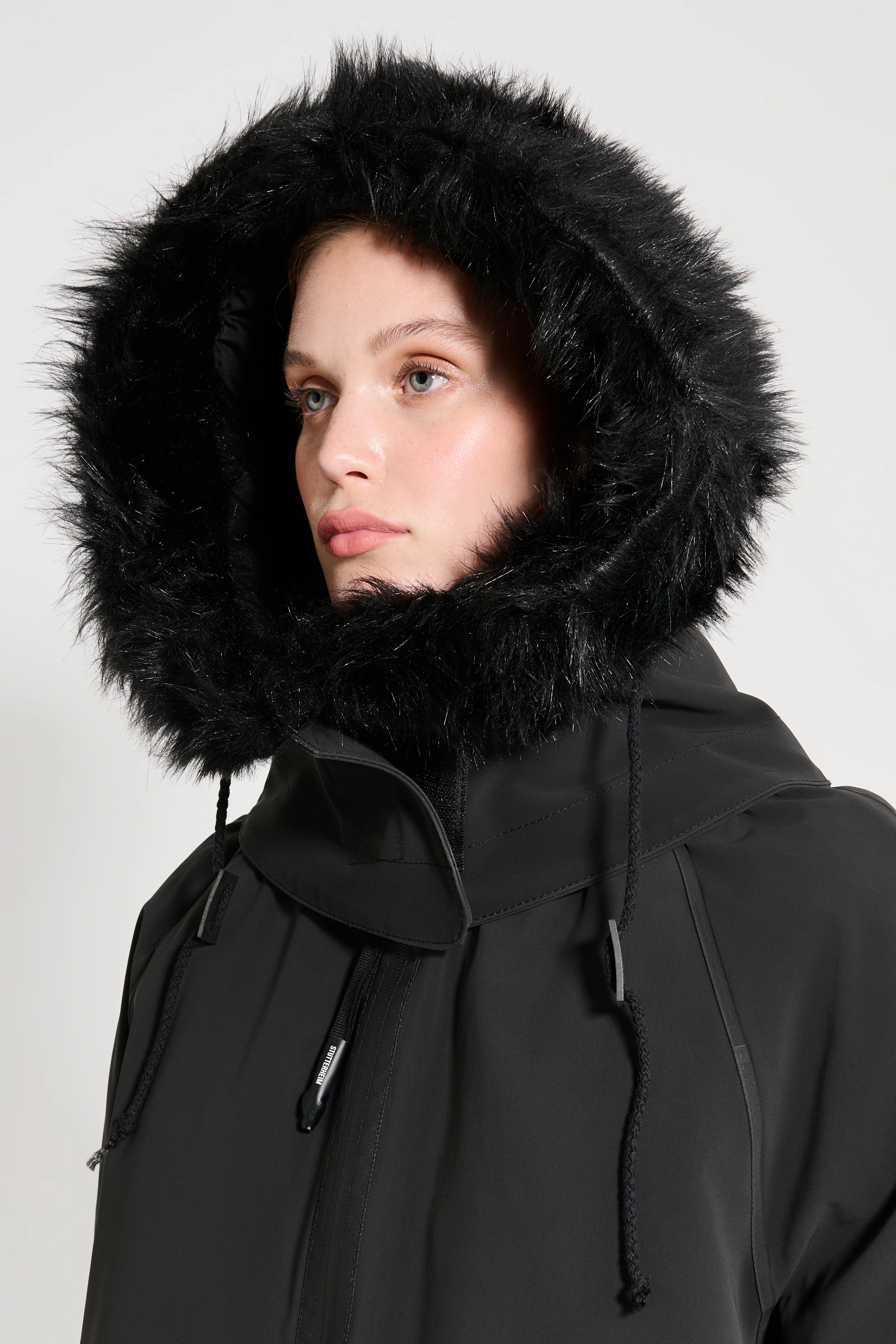 Pajala is an a-line-shaped fishtail parka for women in sturdy and hard-wearing waterproof fabric with a matte finish. It’s insulated with padding for warmth during the winter season. Expertly made, this warm rain jacket is tailored with double-welded seams for complete protection against wet and cold weather. The detachable and adjustable collar and hood with a faux fur brim add extra comfort and warmth to the style. The model is 176 cm / 5′ 8″ Wearing → SIZE S GARMENT DETAILS - Midweight 280-gram shell fabric - Matte-textured finish - Completely waterproof - 150-gram technical insulator filling - Polyester lining - A-line silhouette - Knee-length - Adjustable drawstring fishtail back detail - Aqua guard zipper - Detachable hood with faux fur brim - Adjustable toggles and overlapping velcro front closure on hood - Knitted wristlets - Fleece-lined side pockets - Fleece-lined inner pocket - Double-welded seams - +20 000 mm water column pressure - Designed in Stockholm - Made in Europe MATERIAL Coating: 100% PVC rubberized coating Membrane: 100% polyester Lining: 100% polyester with polly filling Faux fur: 100% polyester Read more about our fabrics