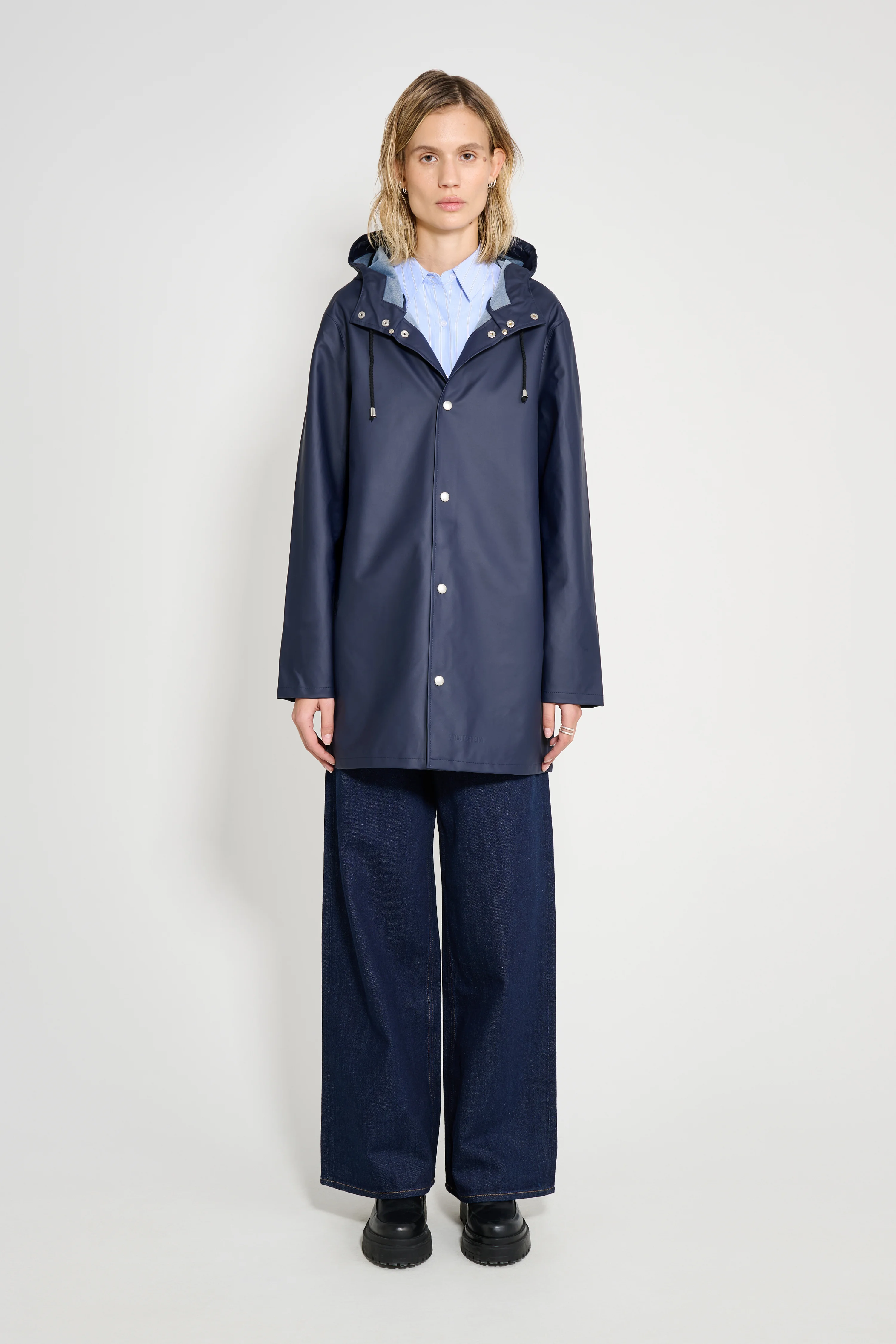 Stockholm Lightweight is a straight-fit raincoat in ultra-light waterproof fabric. Expertly made, it’s tailored with double-welded seams for complete protection against the rain. The drawstring hood and under-arm eyelets add ease of movement and comfort in uncomfortable weather. The thin and packable fabric makes this garment perfect when on the go. The model is 175 cm / 5′ 9” Wearing → SIZE XS GARMENT DETAILS - Lightweight 230-gram fabric - Packable - Completely waterproof - Straight unisex fit - Snap metal button closures - Drawstring hood - Open welt pockets - Double welded seams - Under-arm eyelets for ventilation - +20 000 mm water column pressure - Designed in Stockholm - Made in Europe MATERIAL Coating: 100% PVC rubberized coating Membrane: 100% polyester Read more about our fabrics